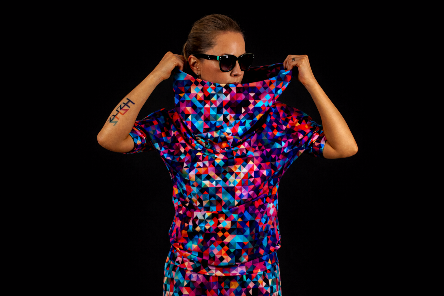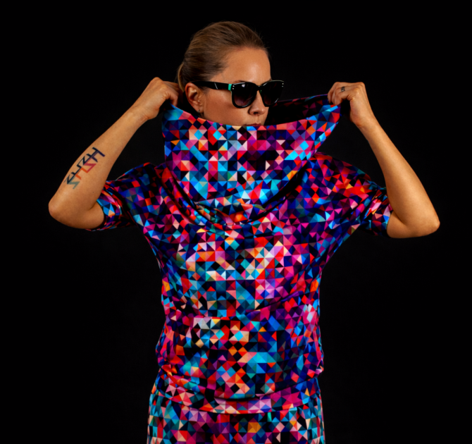 The hoodie has been designed with multi-functionality in mind. Delicate, pleasant to the skin knit combined with a very colorful, geometric print emphasize the sporty and casual character. It will also be perfect for elegant stylizations. The hoodie can be complemented by gaiters made of the same fabric, which adorn the forearms, that is available in our store for separate purchase. Thanks to them, you can extend the sleeves on colder days.