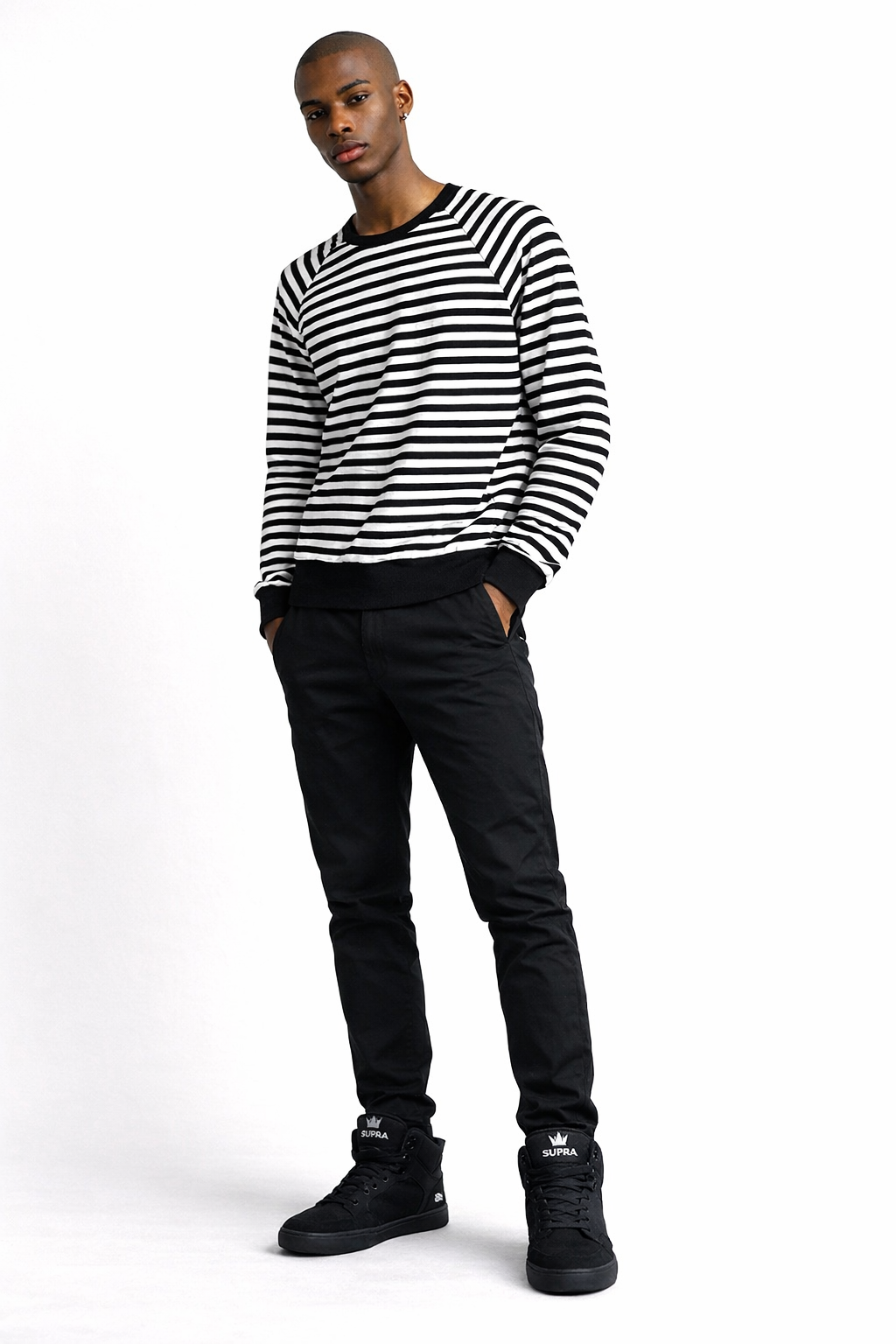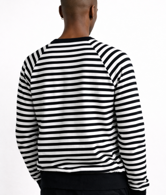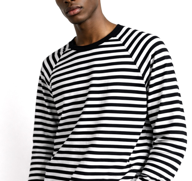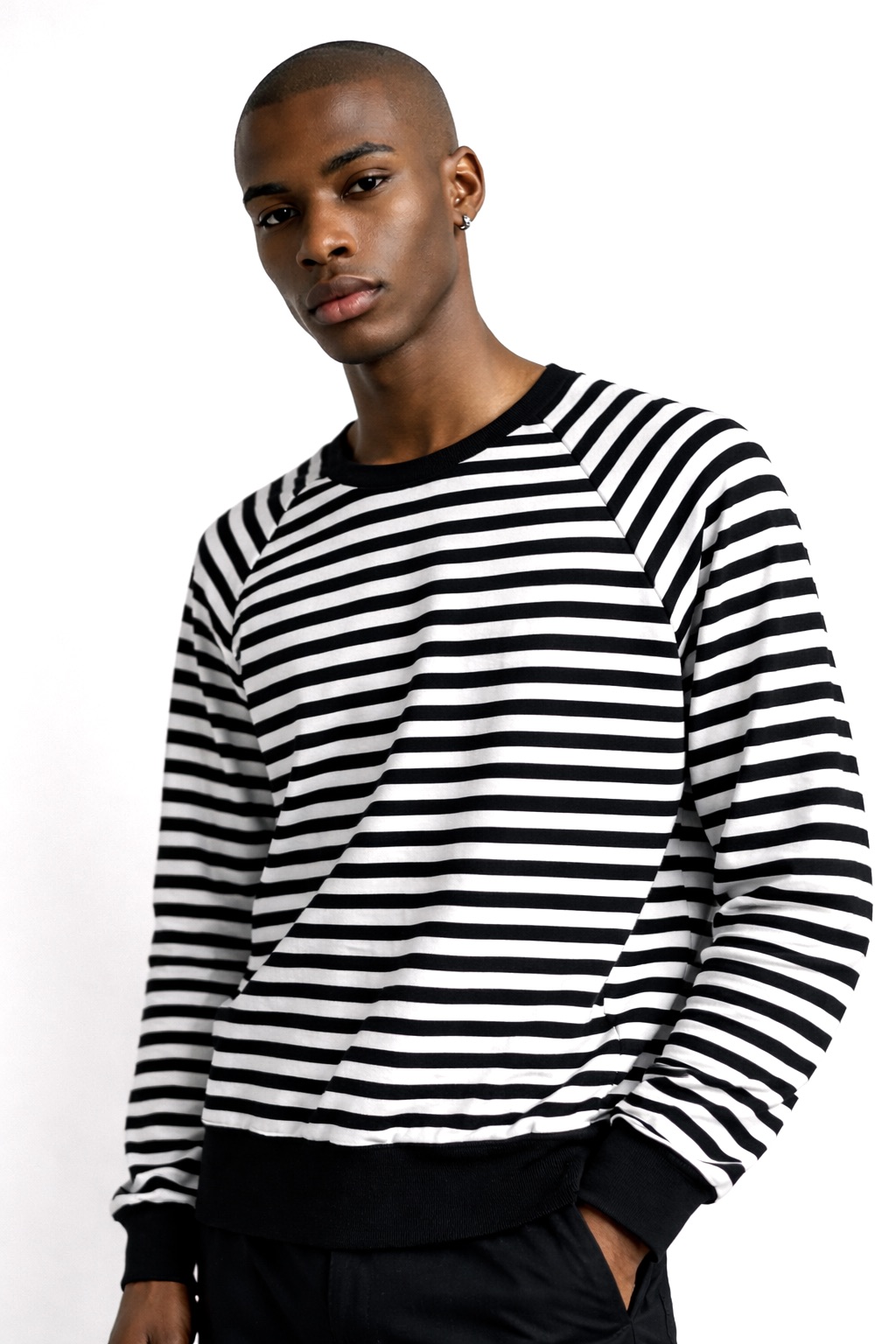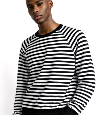 Bluza z bawełny w dziane czarno-białe paski. W ofercie ZUZU rękawy raglanowe. Całość wykończona czarnym ściągaczem i estetyczną lamówką.