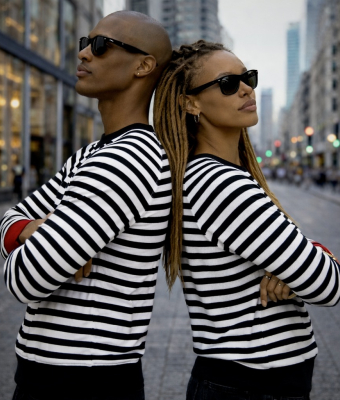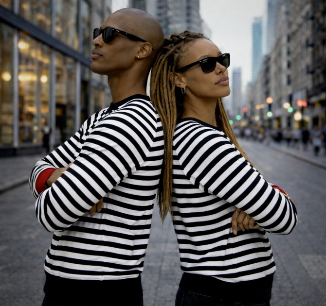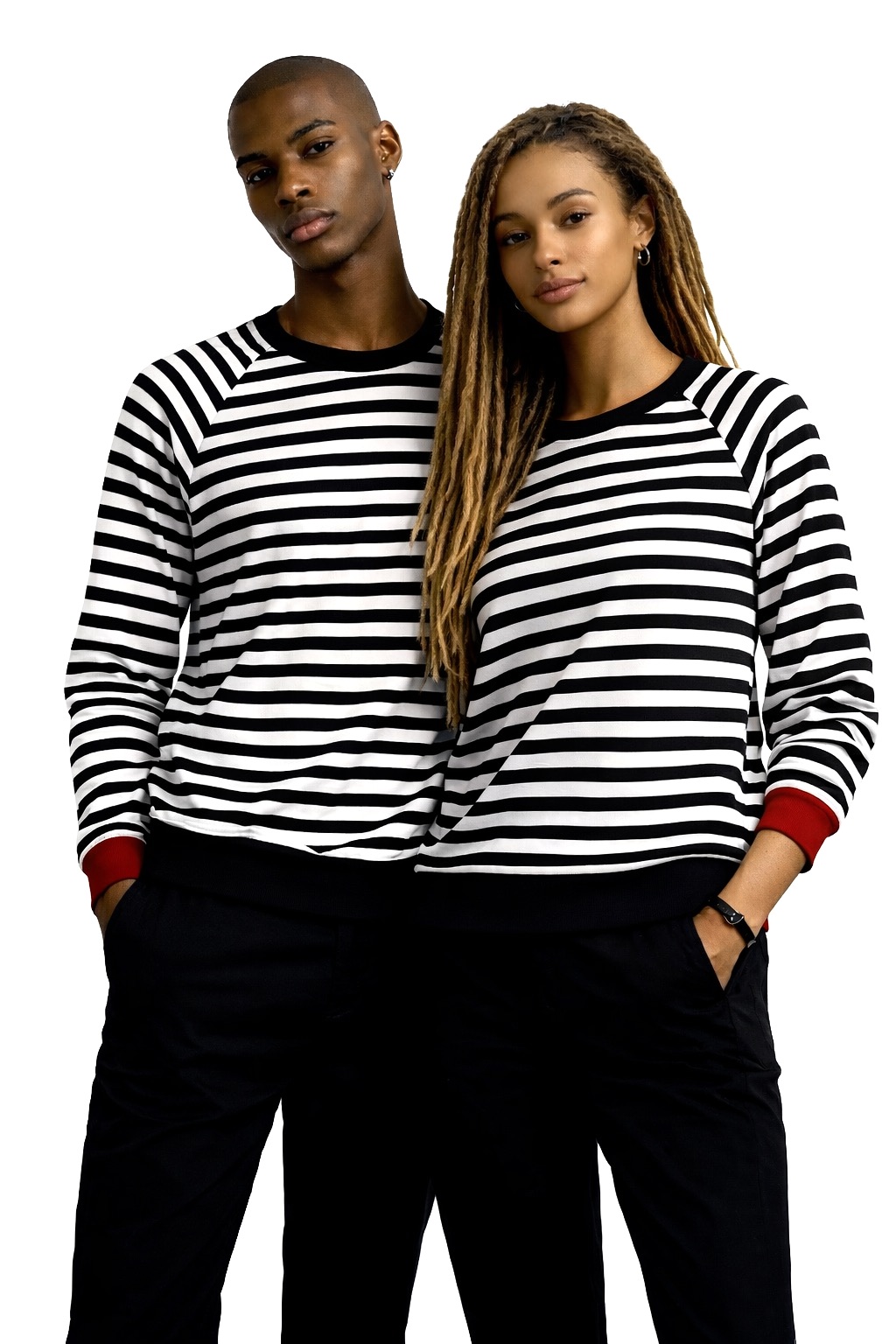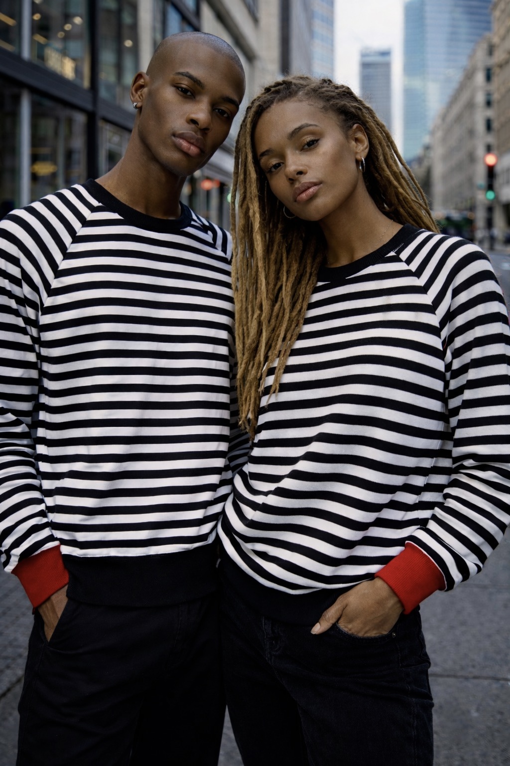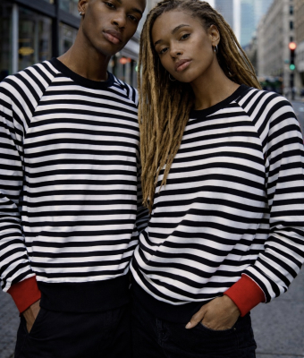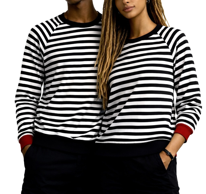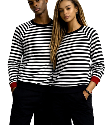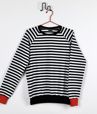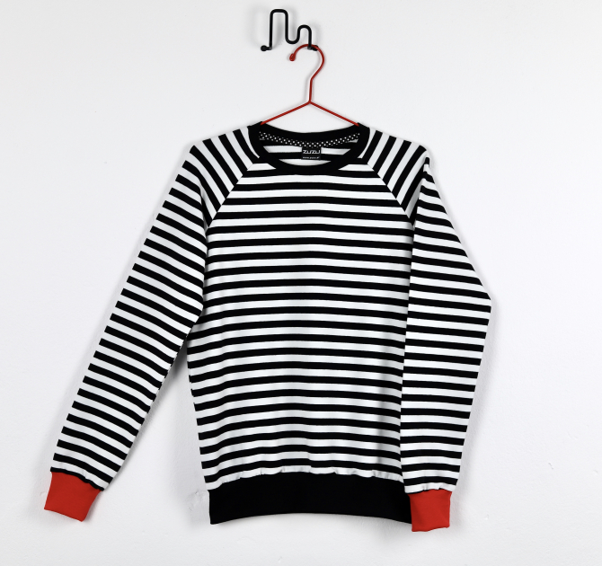 Bluza z bawełny w dziane czarno-białe paski. W ofercie ZUZU rękawy raglanowe. Całość wykończona czarnym i czerwonym ściągaczem oraz estetyczną lamówką.