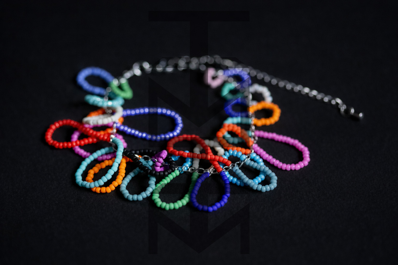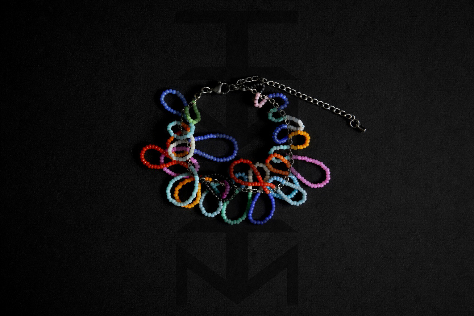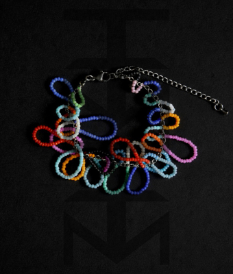 Bransoletka wykonana z kolorowych koralików szklanych i stali chirurgicznej. Bardzo pracochłonny, ale i efektowny projekt:)