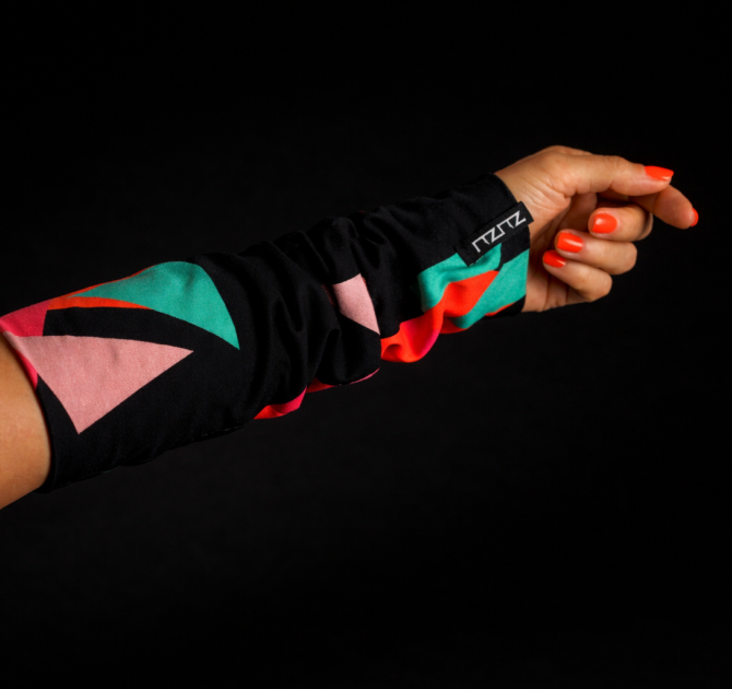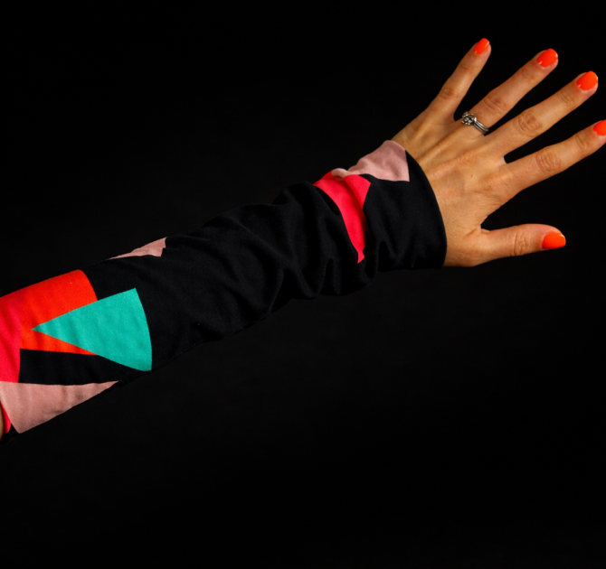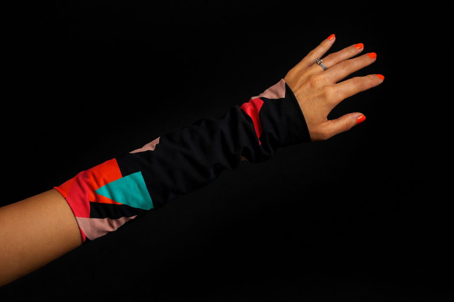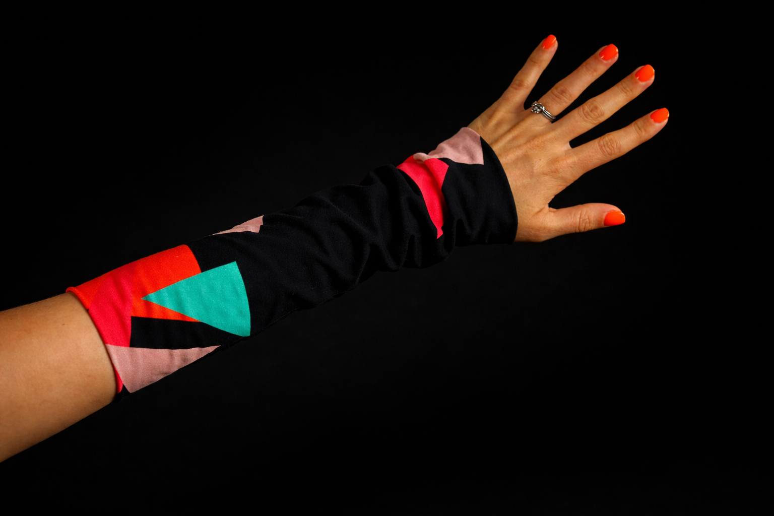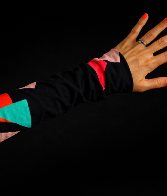 Getry z dzianiny bawełnianej na przedramiona. Stanowią element uzupełniający stylizację.