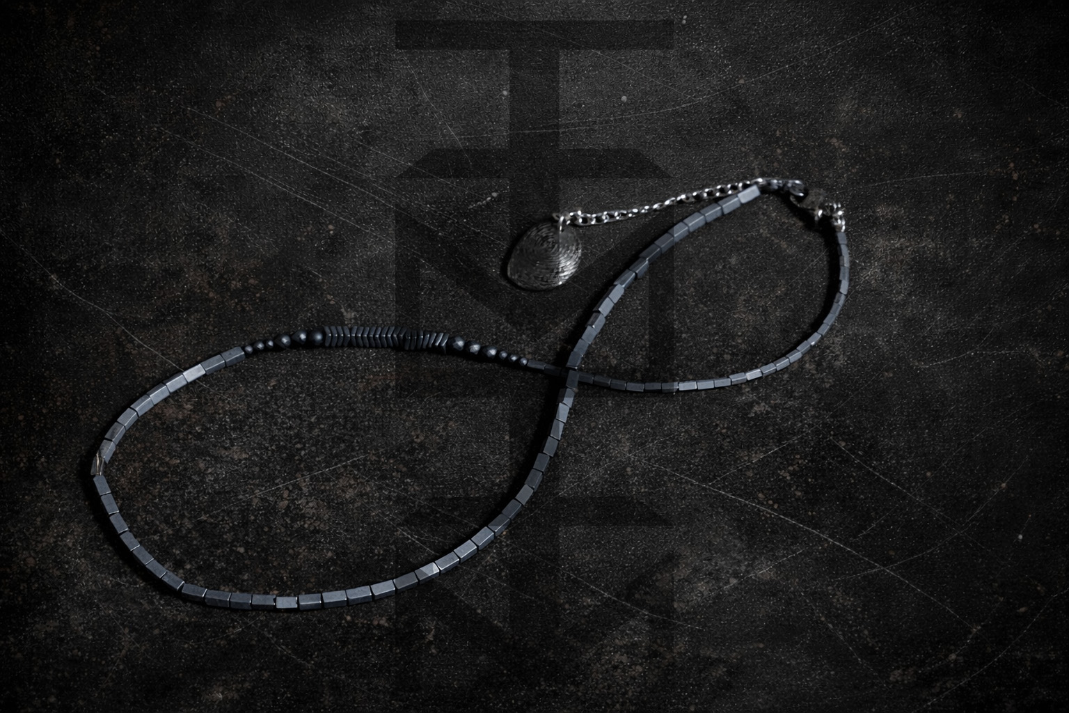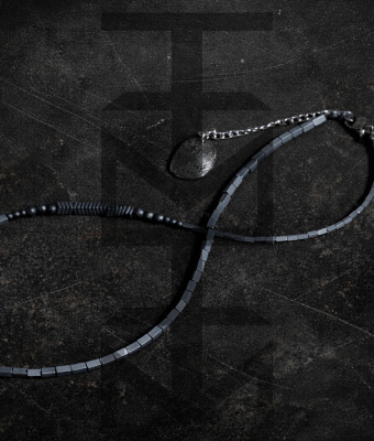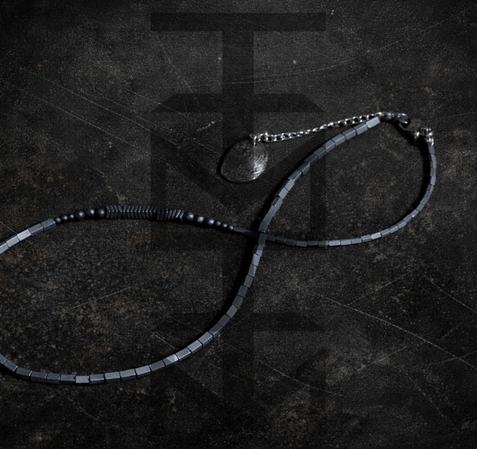 Srebrno-grafitowy naszyjnik wykonany z hematytu i stali szlachetnej. W całości zaprojektowany i wykonany w pracowni ZUZU z najwyższej jakości półfabrykatów jubilerskich. Odpowiedni dla WEGAN. Idealny na wakacje i prezent!