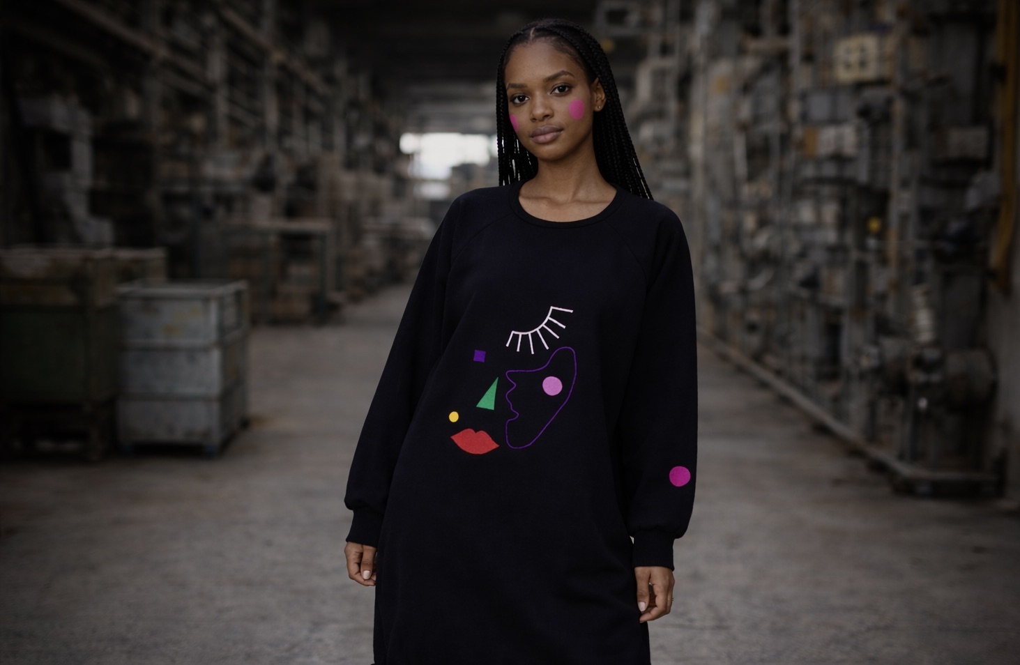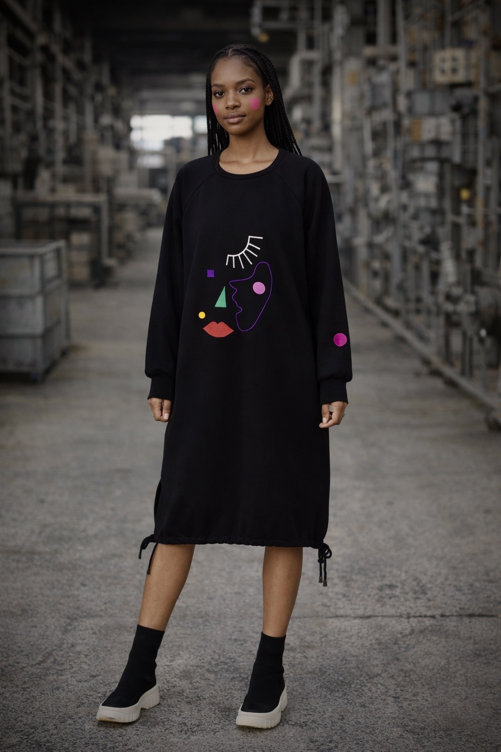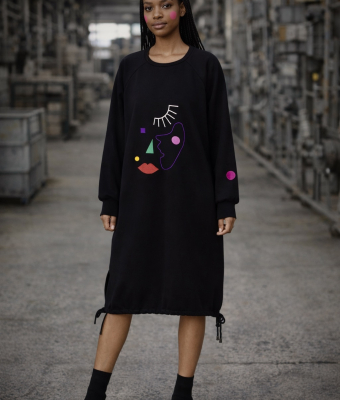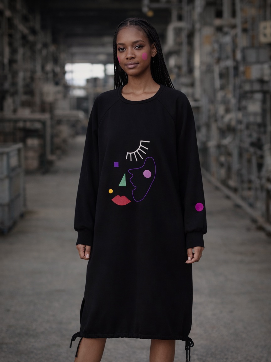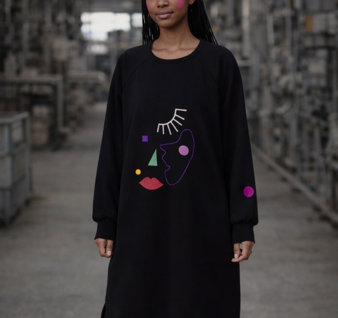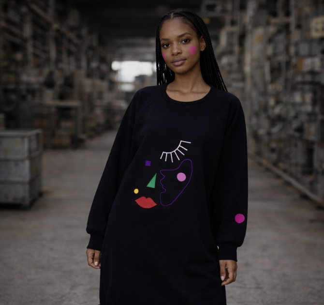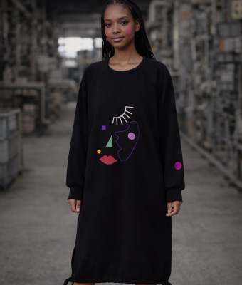 Sukienka/Bluza/Tunika FACE to projekt, który musiał pojawić się w ZUZU. Geometryzacja i uproszczona forma, która kiedyś dała początek kubizmowi w sztuce Pabla Picassa, dzisiaj stała się inspiracją dla elementu haftowanego naszej sukienki.