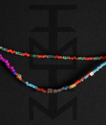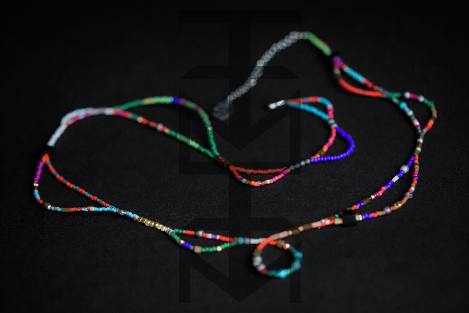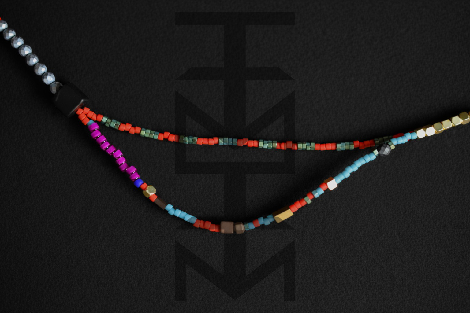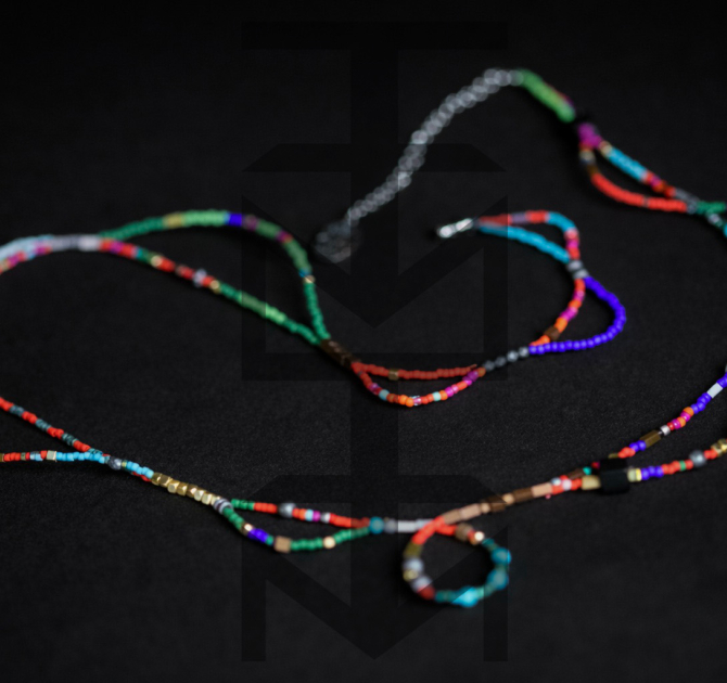 To nasz autorski projekt. Delikatna konstrukcja z drobnych koralików, ułożonych w nieregularny, lekko falujący kształt. Koraliki są wielokolorowe – widać intensywne czerwienie, zielenie, kobalty, przeplatane pojedynczymi metalicznymi elementami, które dodają całości subtelnego blasku. Kolorystyka i medalik z czaszką to nawiązanie do FRIDY.