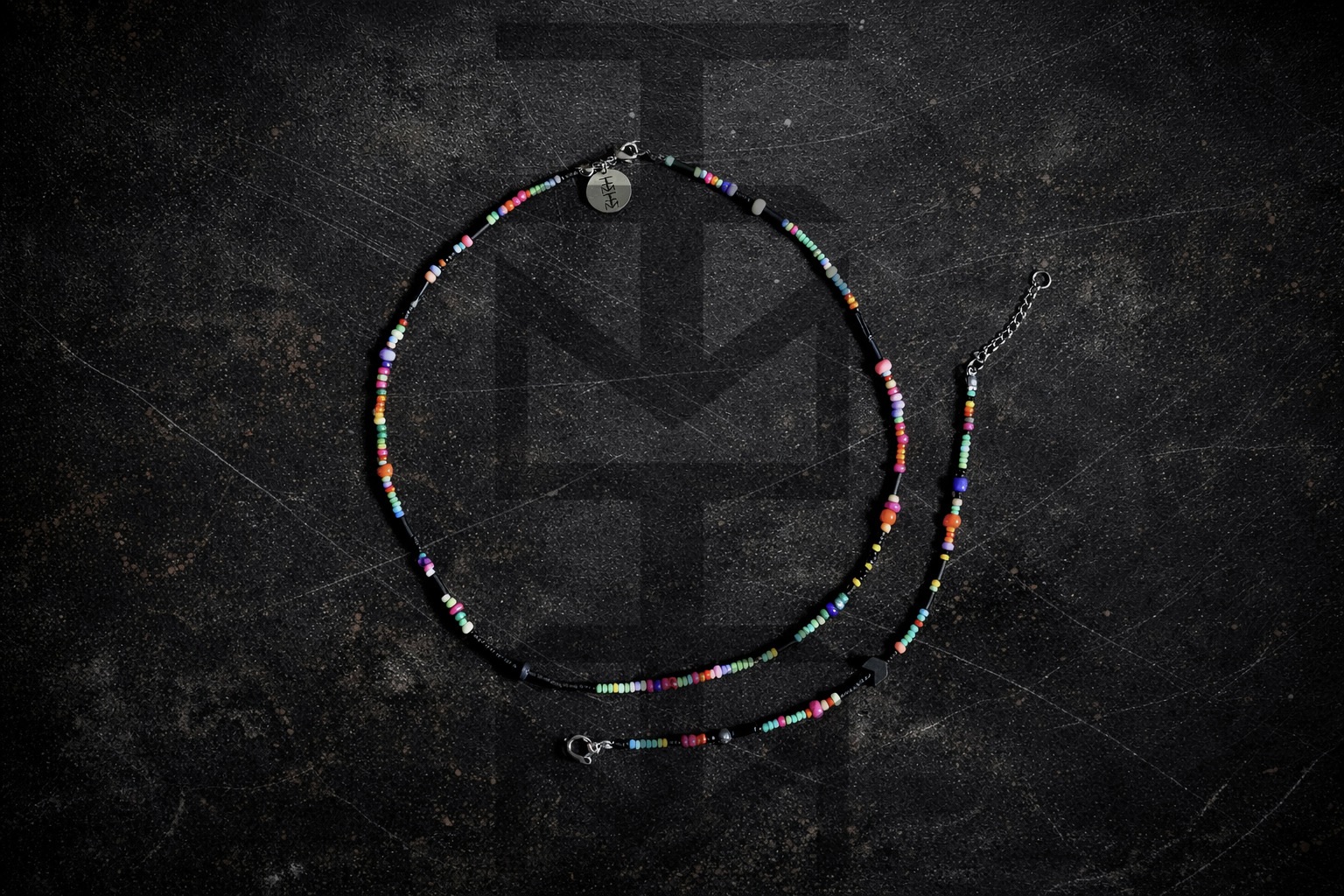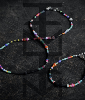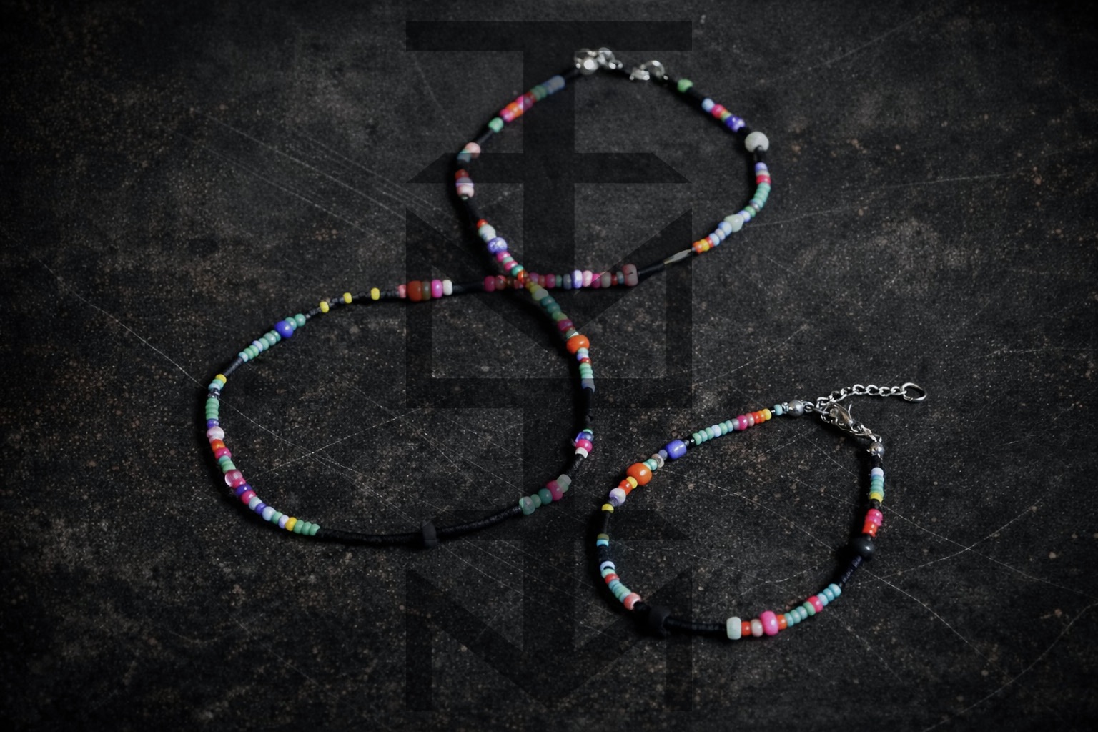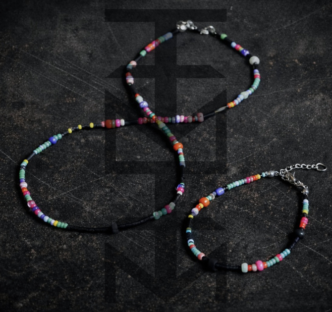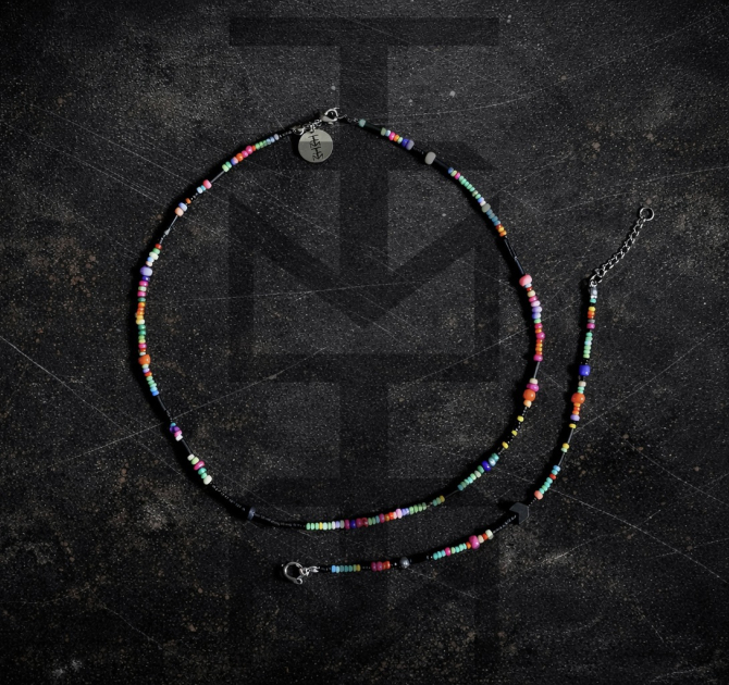 Komplet wykonany z wielokolorowych koralików szklanych, hematytu oraz skały wulkanicznej. W skład kompletu wchodzi: naszyjnik i bransoletka.