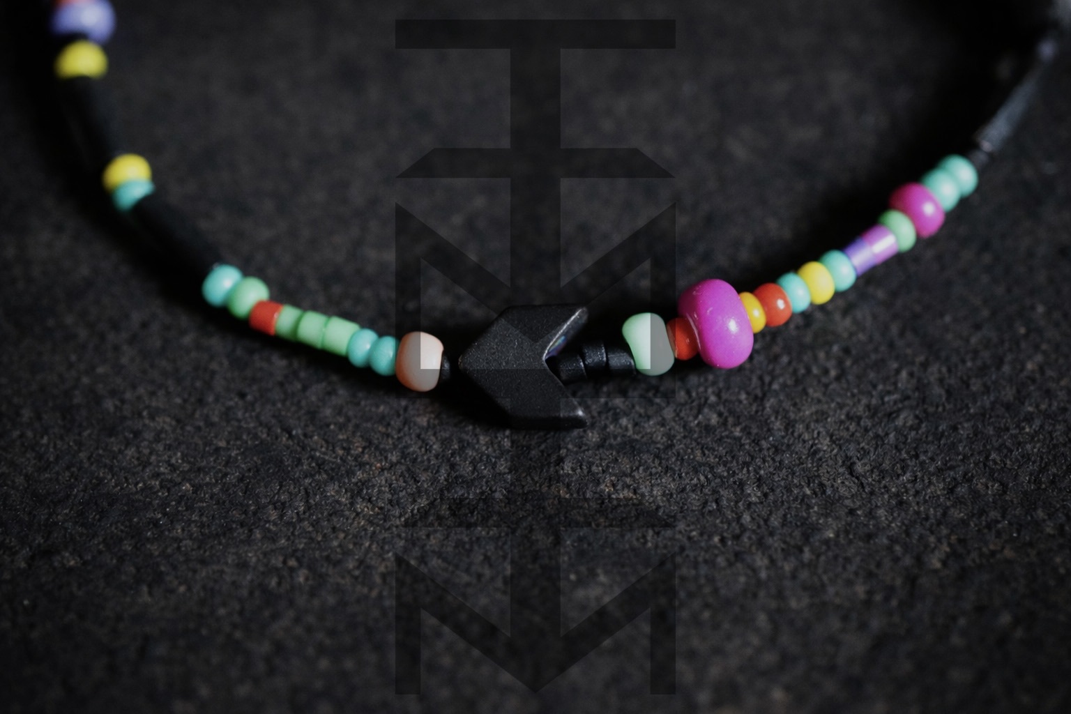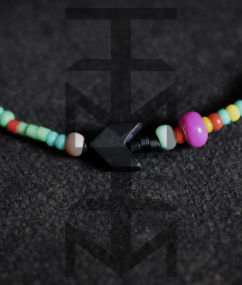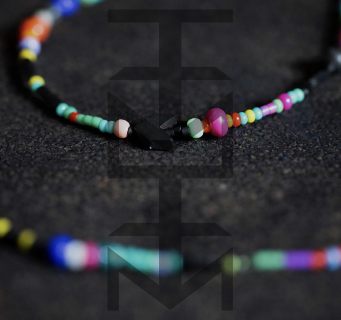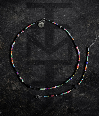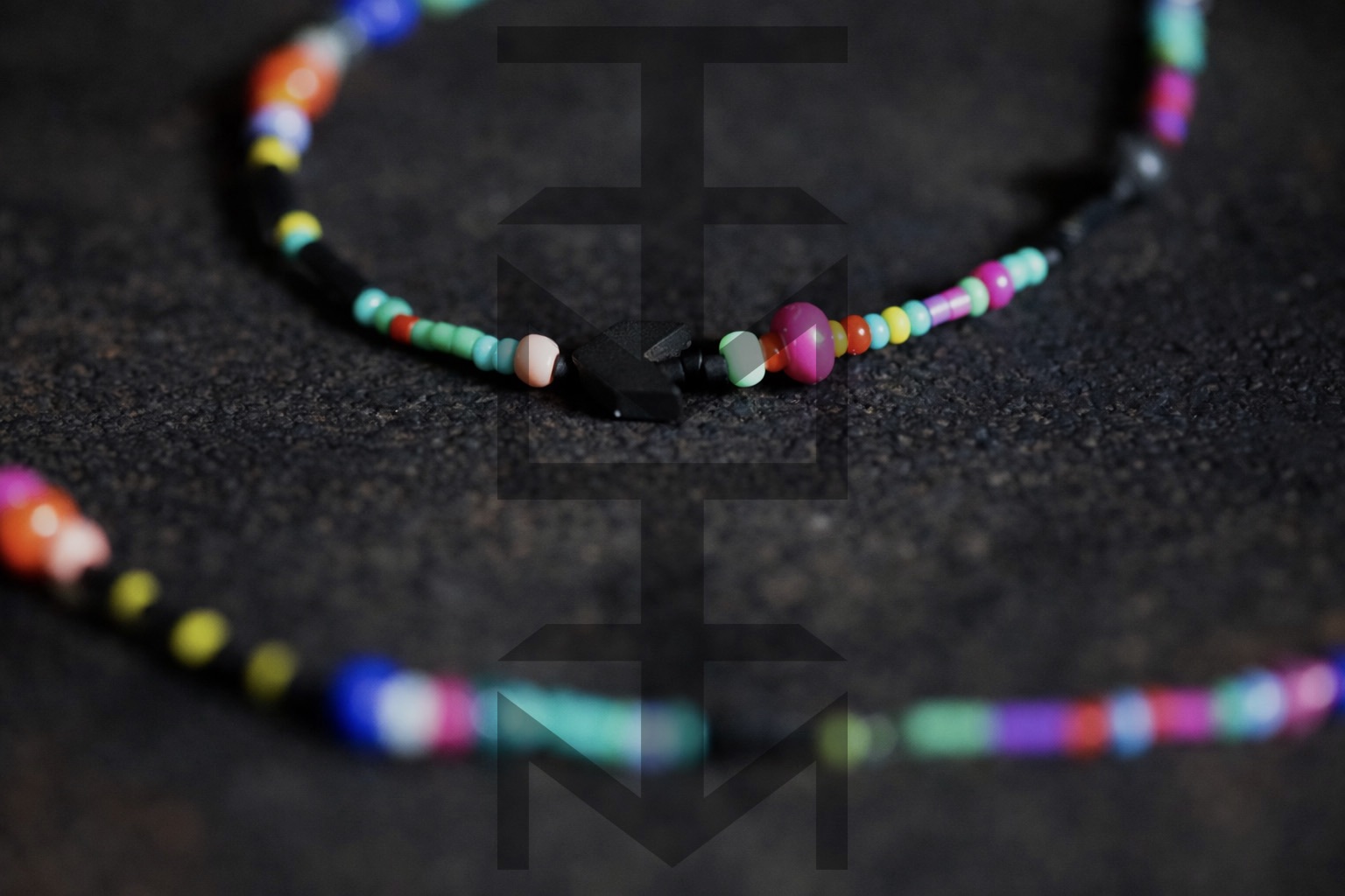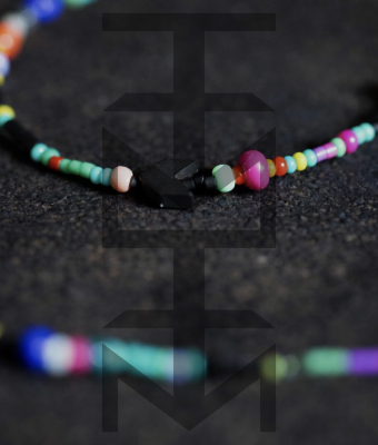 Komplet wykonany z wielokolorowych koralików szklanych, hematytu oraz skały wulkanicznej. W skład kompletu wchodzi: naszyjnik i bransoletka.