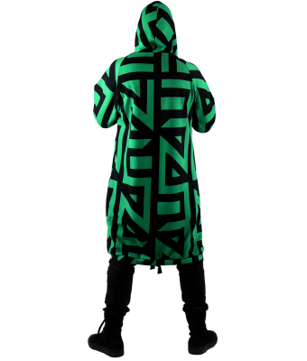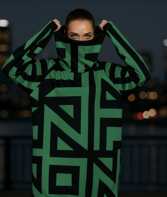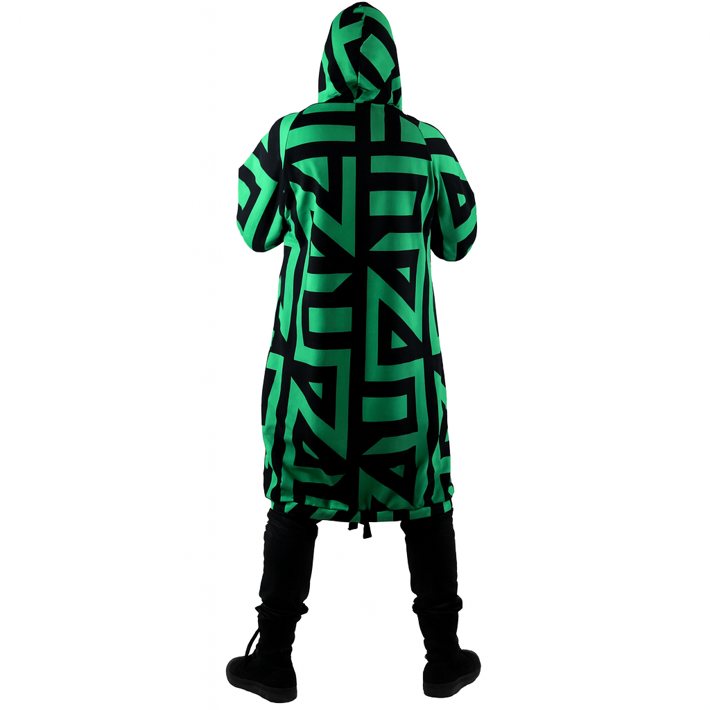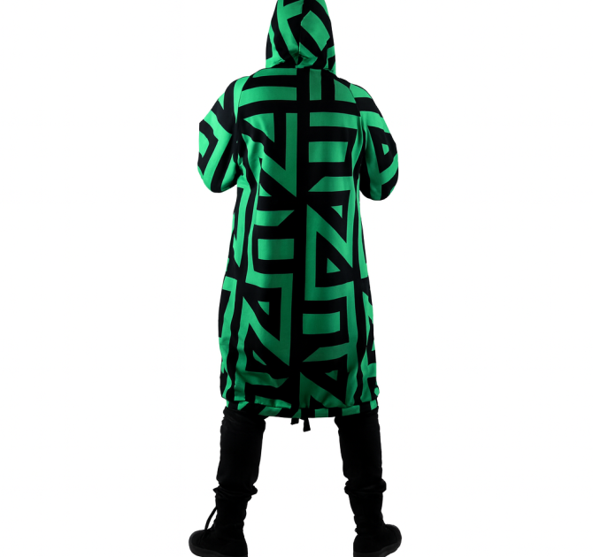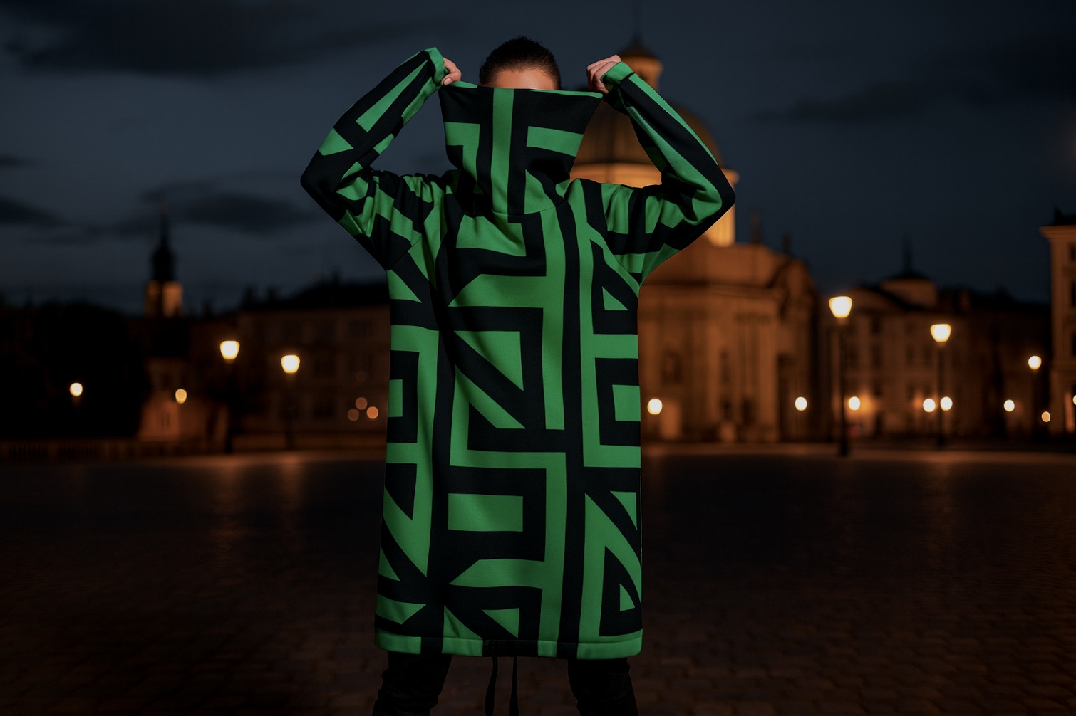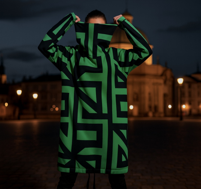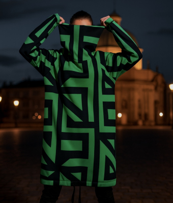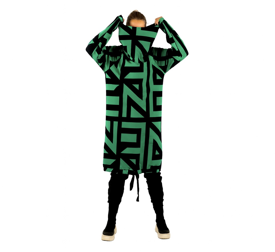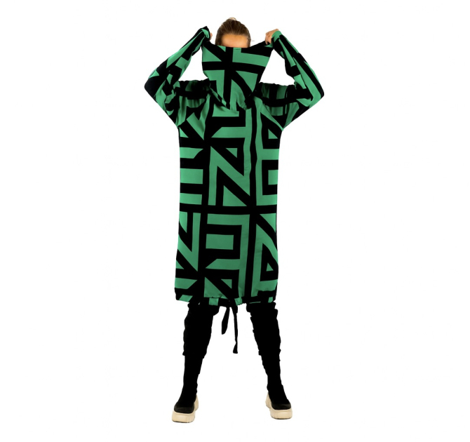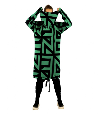 Długa bluza o bardzo prostym kroju z rękawem raglanowym i dużym kapturem. Każda z warstw kaptura wykrojona została z jednego kawałka dzianiny. Bluza posiada kieszenie.