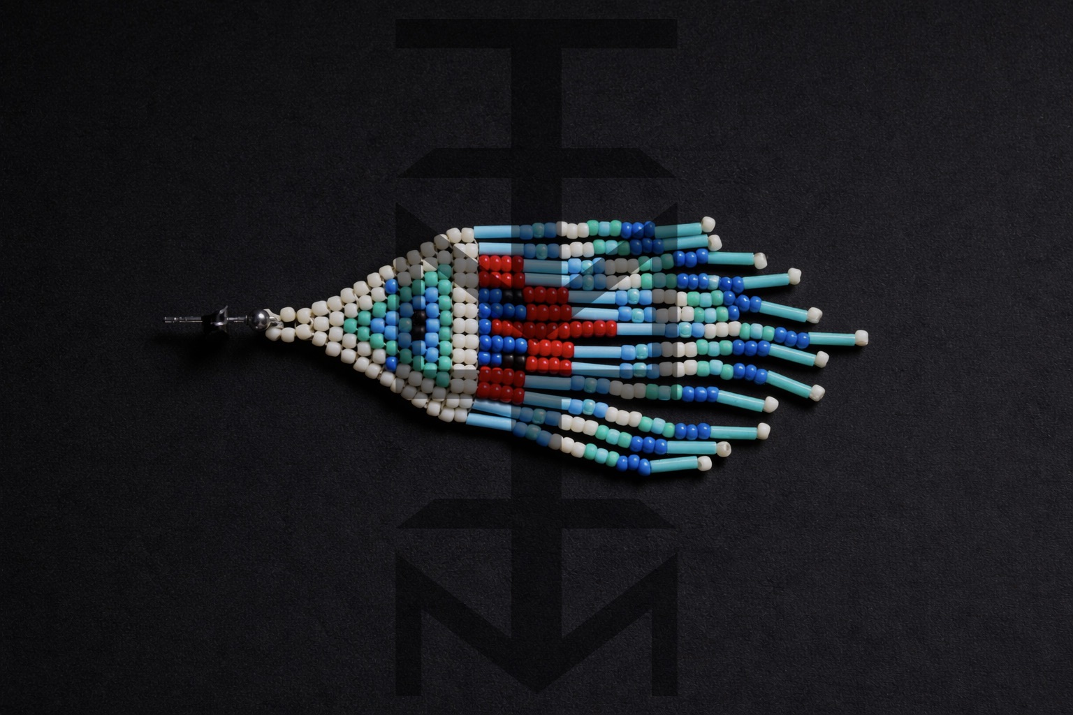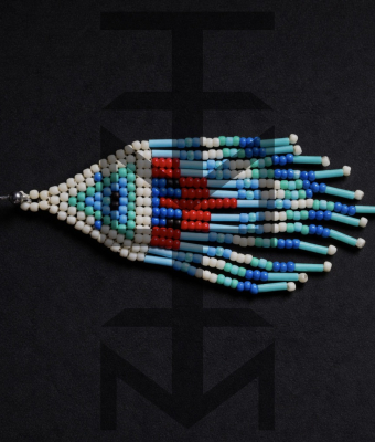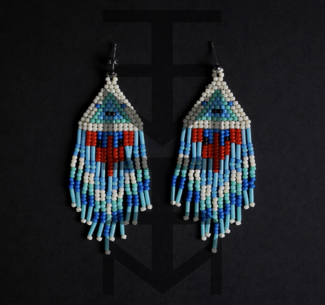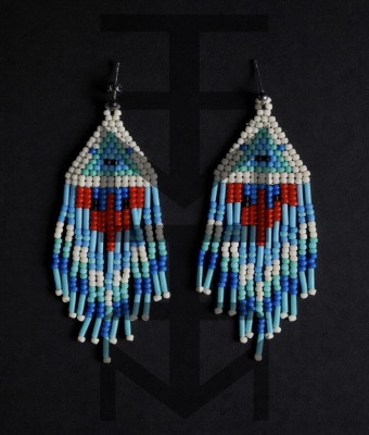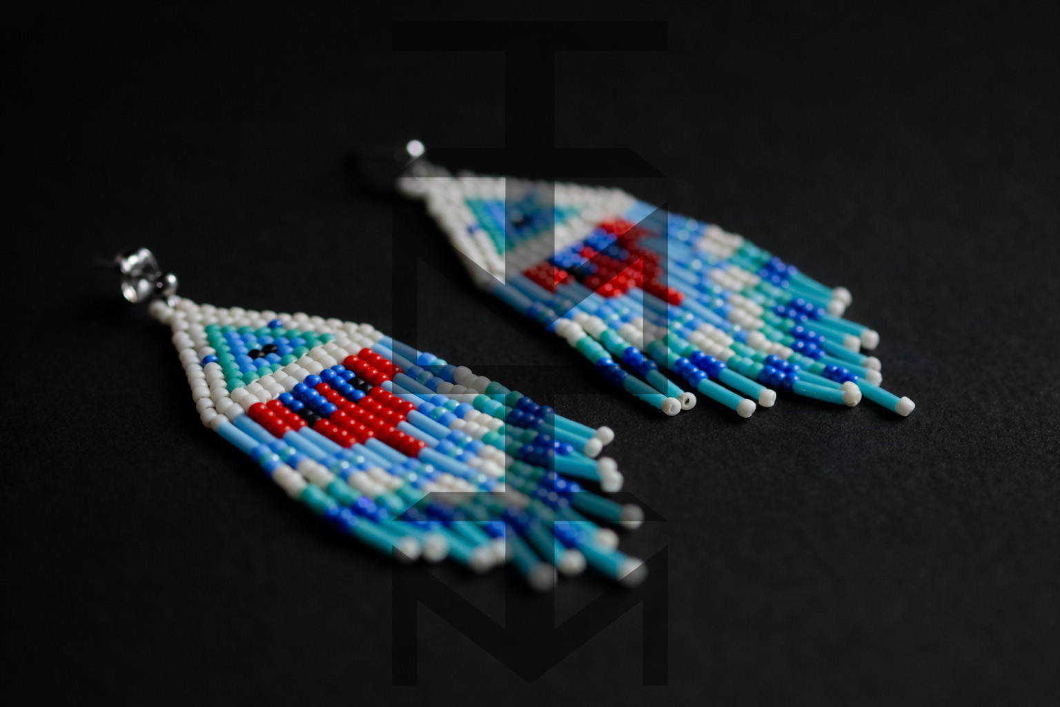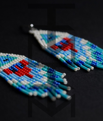 Efektowne kolczyki w stylu indiańskim-CZIROKEZI zostały zaprojektowane i w całości wykonane czasochłonną techniką beadingu w pracowni ZUZU. Są one duże, ale bardzo lekkie. Piękne połączenie kolorystyczne czerwieni, niebieskiego i turkusu świetnie sprawdzi się w letnich stylizacjach. Inspiracją do ich powstania była kultura Indian.