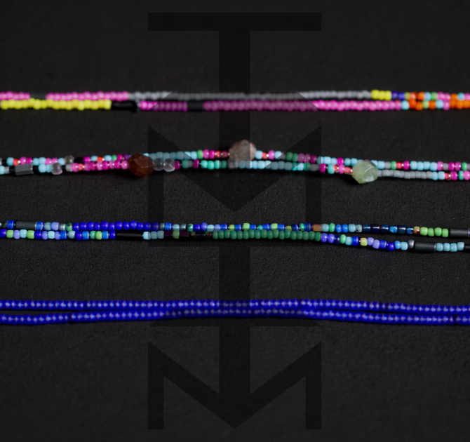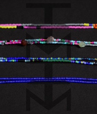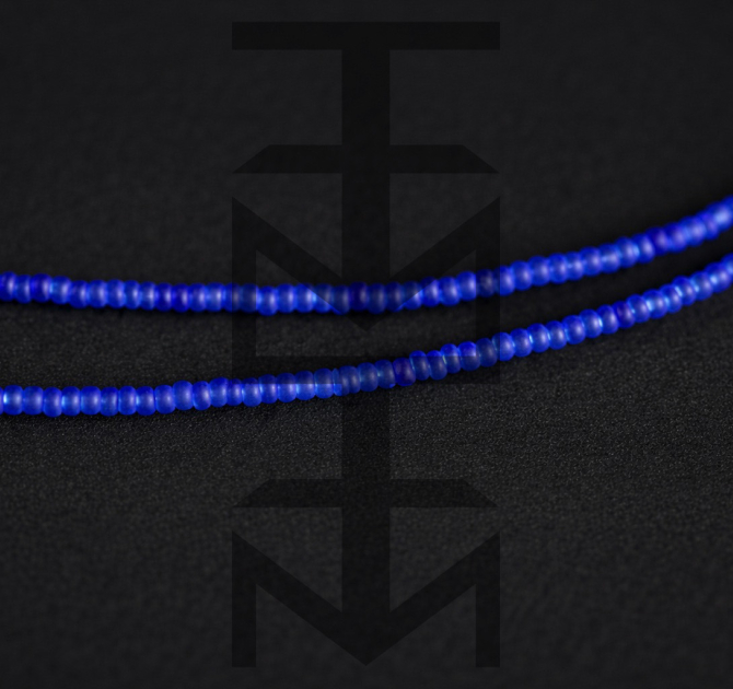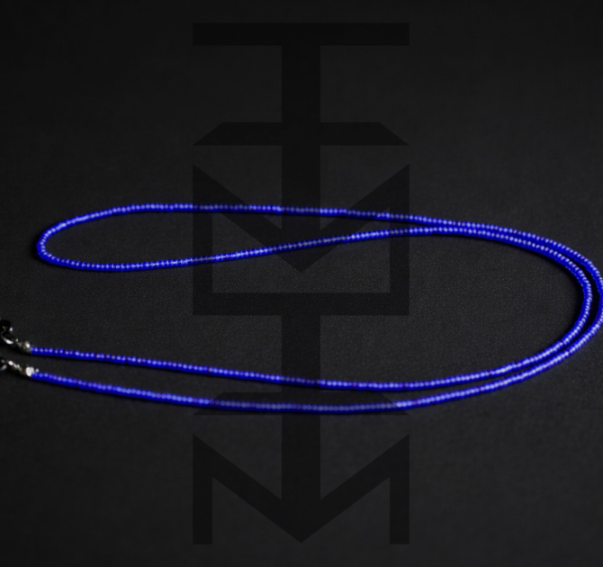 Łańcuszek wykonany ze szklanych koralików w kolorze kobaltowym oraz elastycznych gumek pasujących do różnych okularów. To doskonały gadżet dla osób aktywnych ceniących w modzie praktyczne rozwiązania.