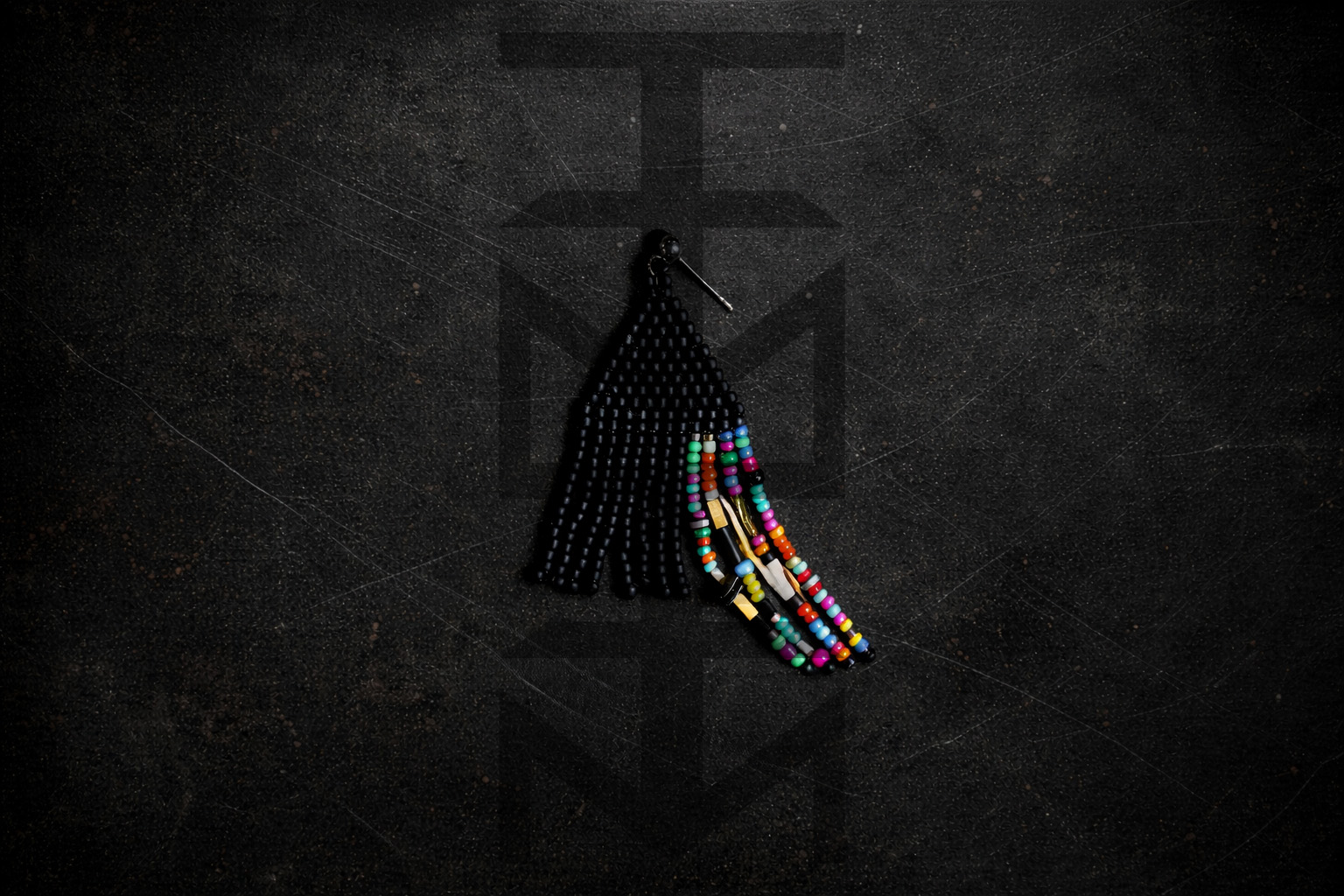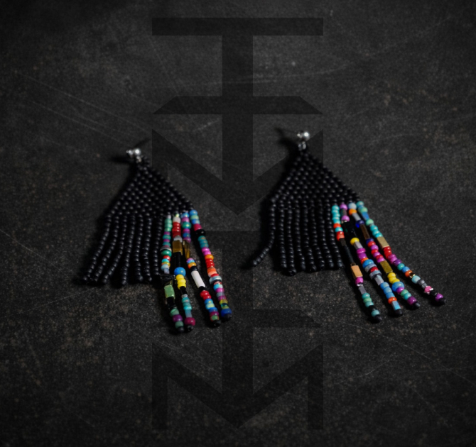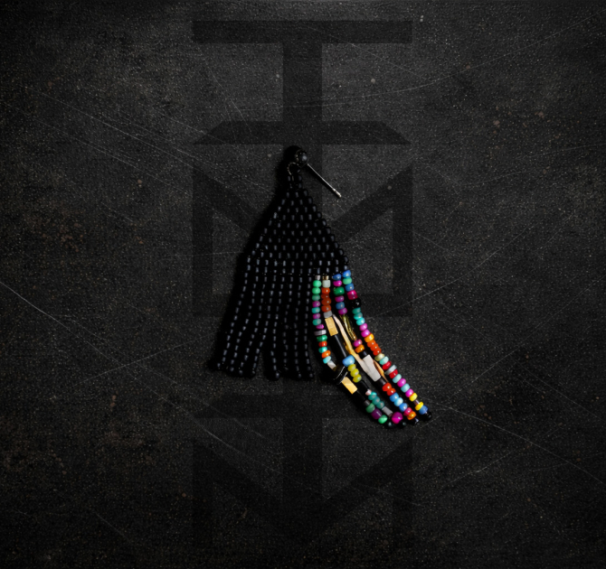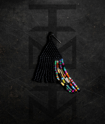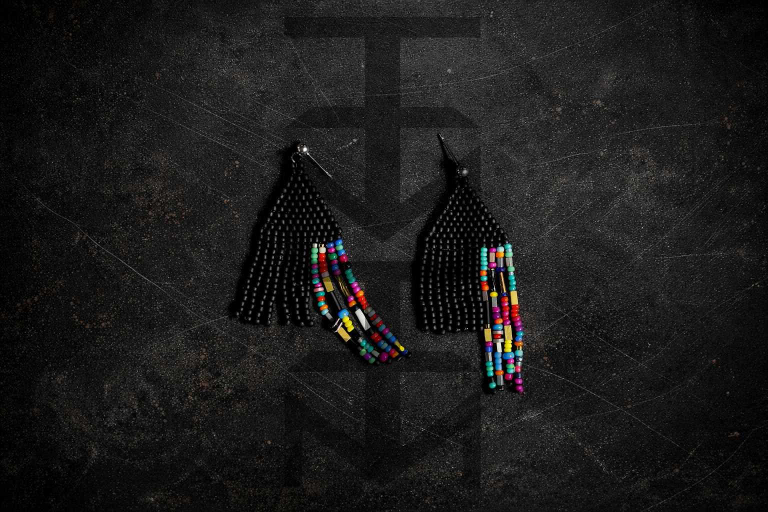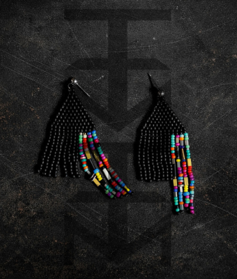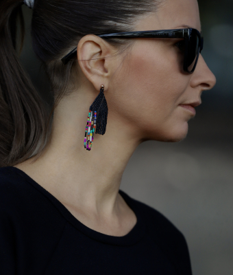 Efektowne kolczyki czarne z delikatnym akcentem kolorowych koralików i hematytu. Zostały zaprojektowane i w całości wykonane czasochłonną techniką beadingu w pracowni ZUZU. Są one duże, ale bardzo lekkie.