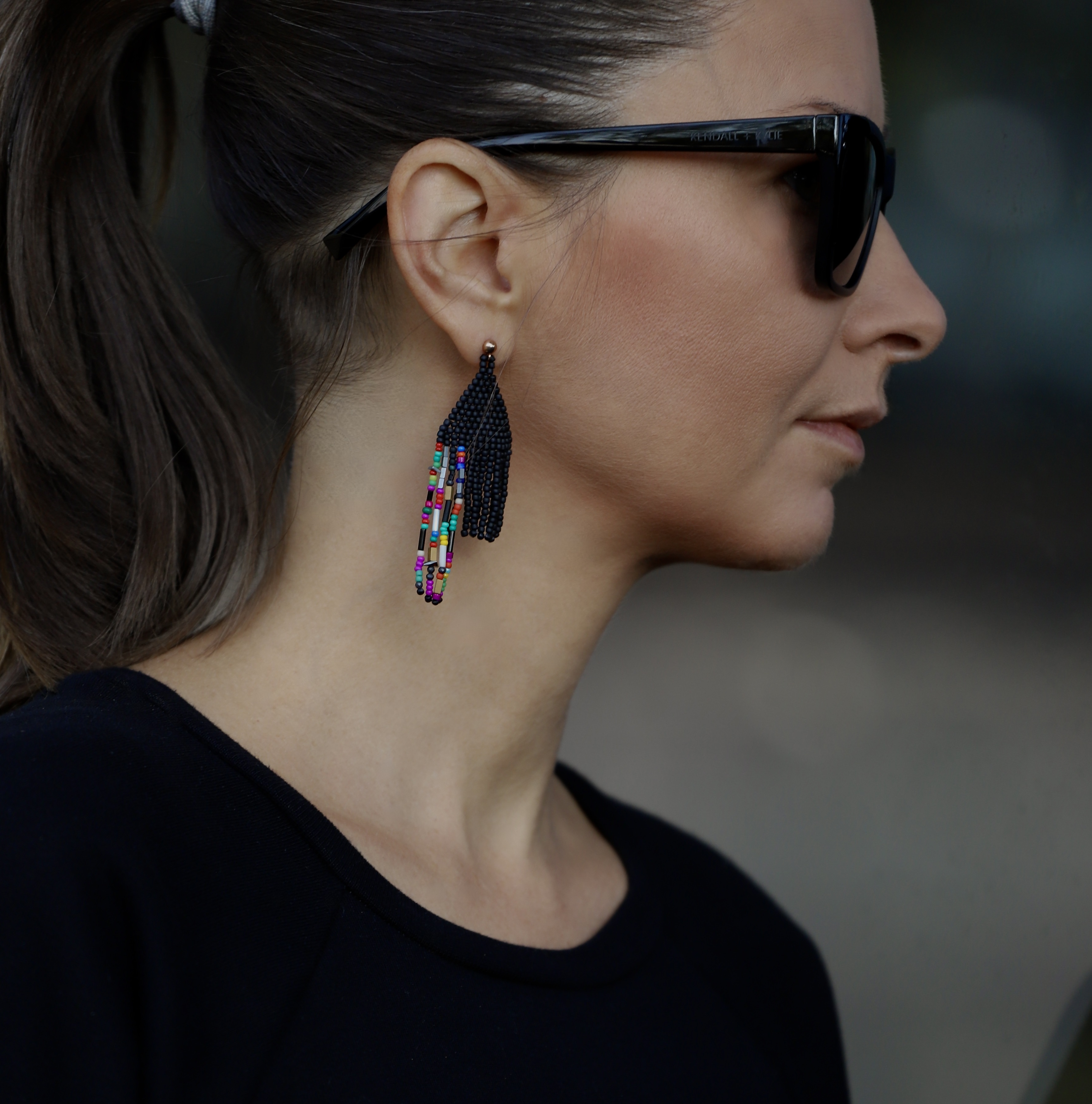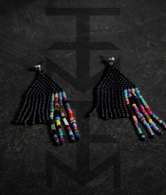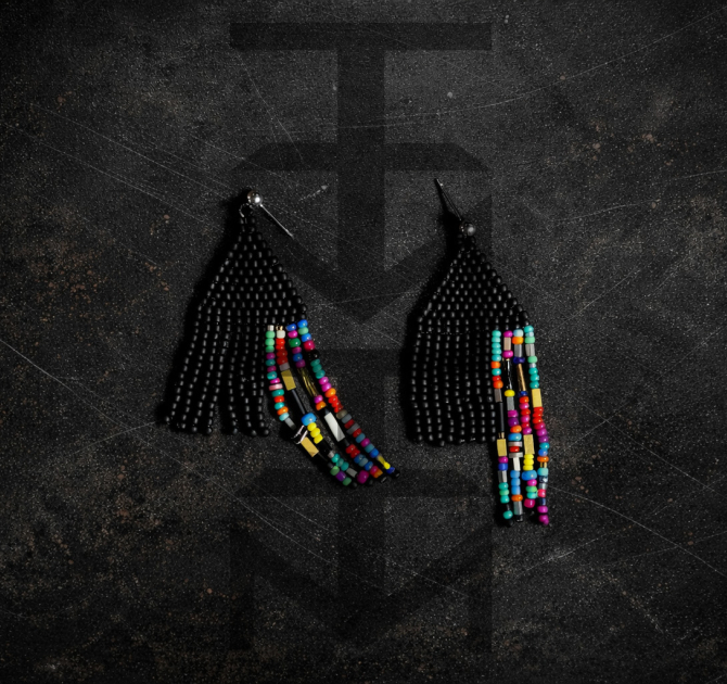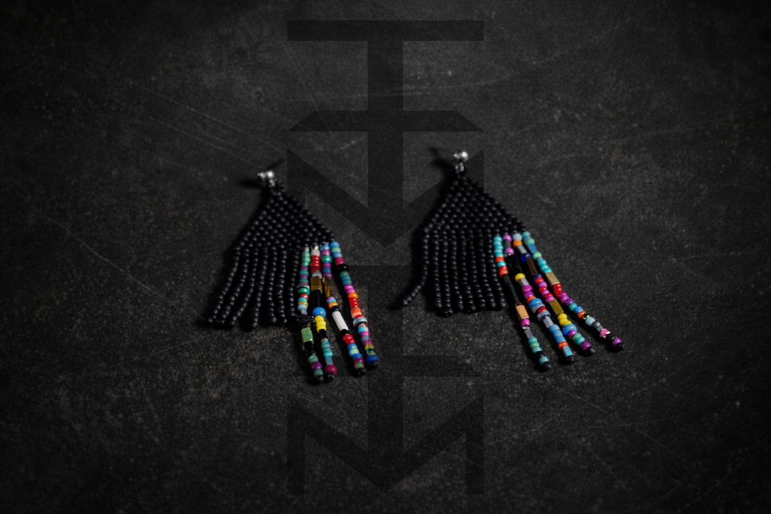 Efektowne kolczyki czarne z delikatnym akcentem kolorowych koralików i hematytu. Zostały zaprojektowane i w całości wykonane czasochłonną techniką beadingu w pracowni ZUZU. Są one duże, ale bardzo lekkie.
