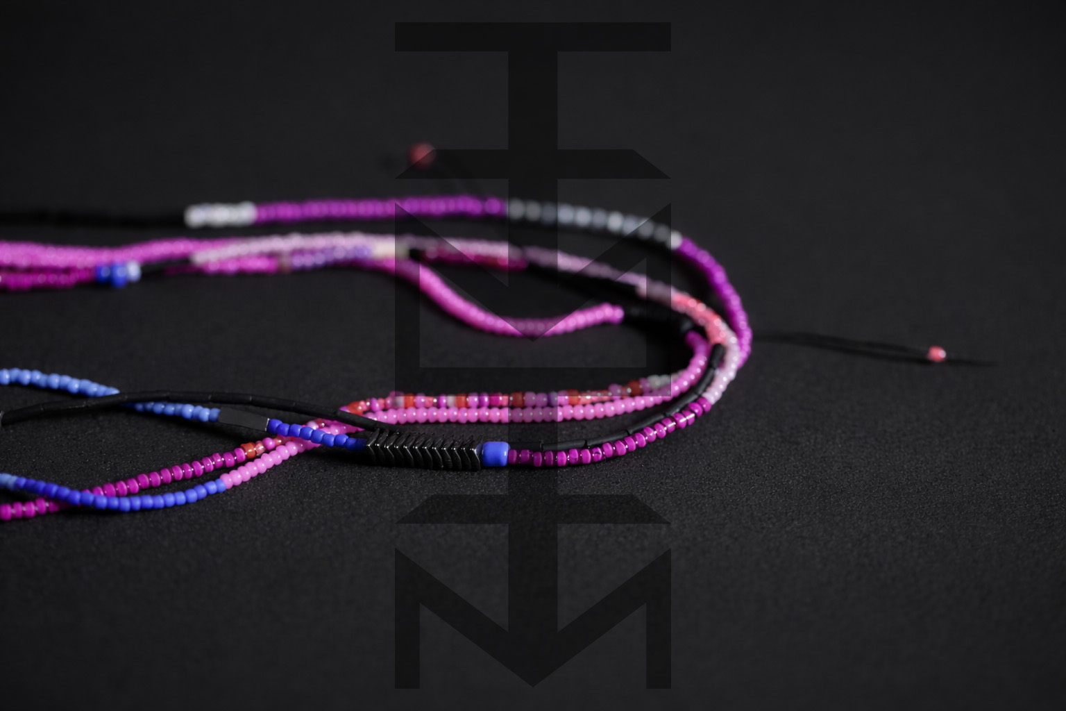 Długi kolorowy naszyjnik wykonany ze szklanych koralików i hematytu. Możliwość regulacji.