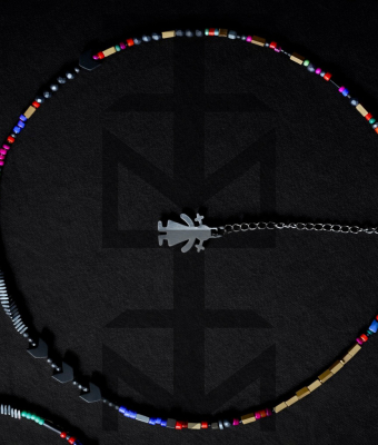 Kolorowy naszyjnik wykonany z hematytu, koralików szklanych i stali szlachetnej. W całości zaprojektowany i wykonany w pracowni ZUZU z najwyższej jakości półfabrykatów jubilerskich. Odpowiedni dla WEGAN. Idealny na wakacje i prezent!
