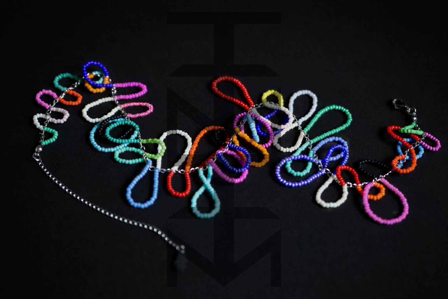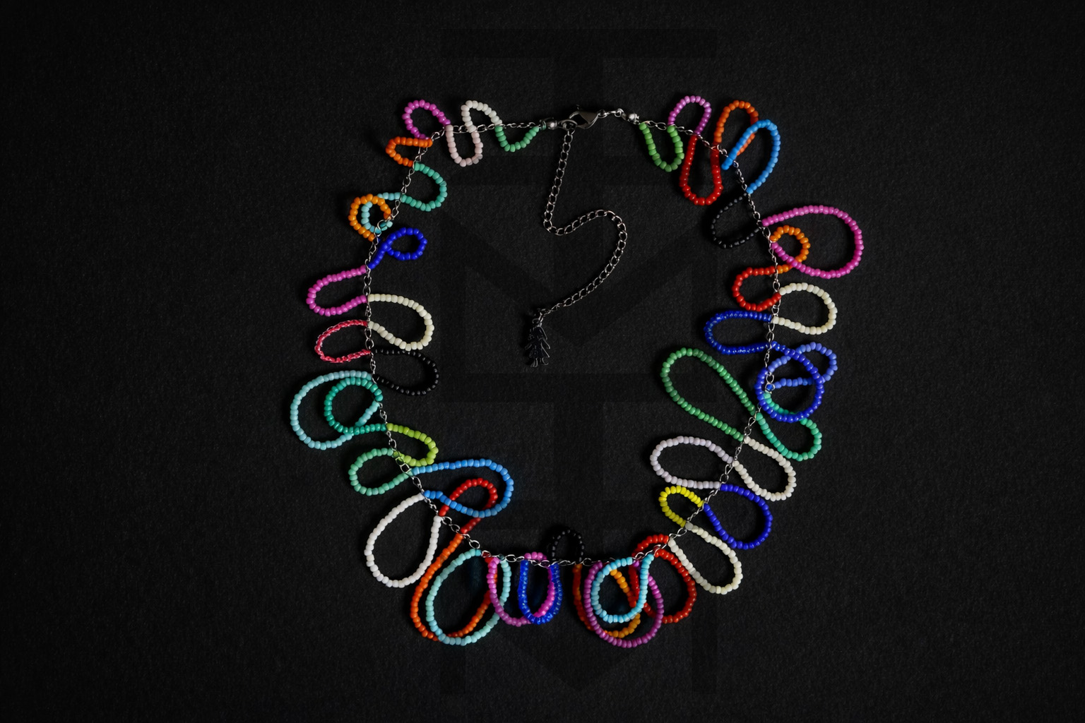 Naszyjnik wykonany z kolorowych koralików szklanych i stali chirurgicznej. Bardzo pracochłonny, ale i efektowny projekt:)