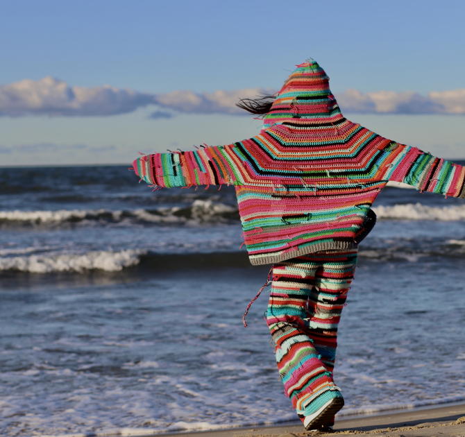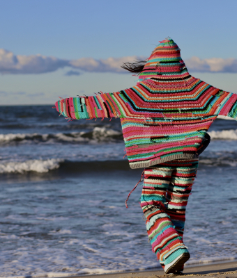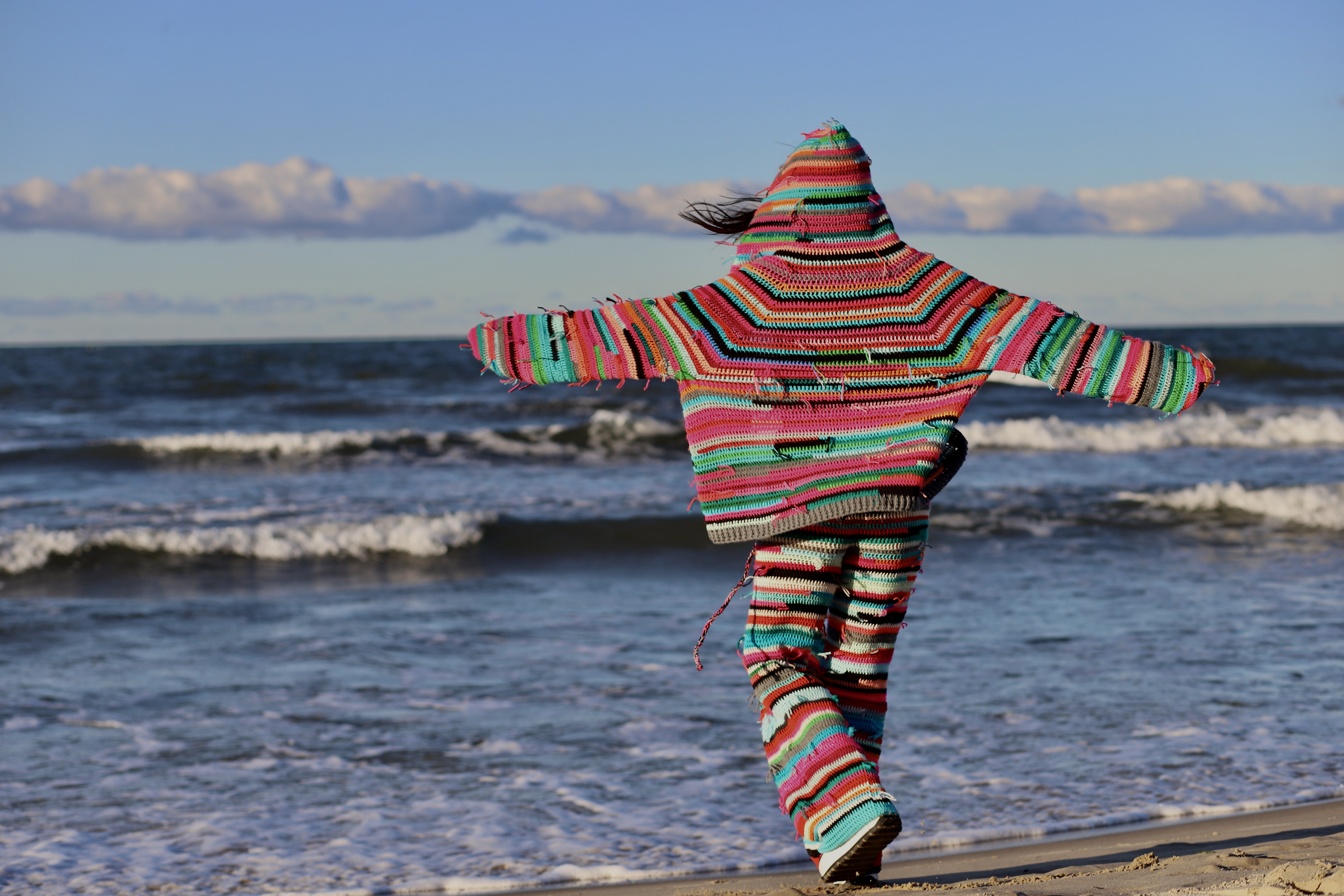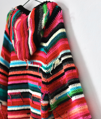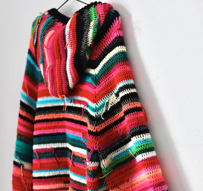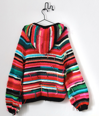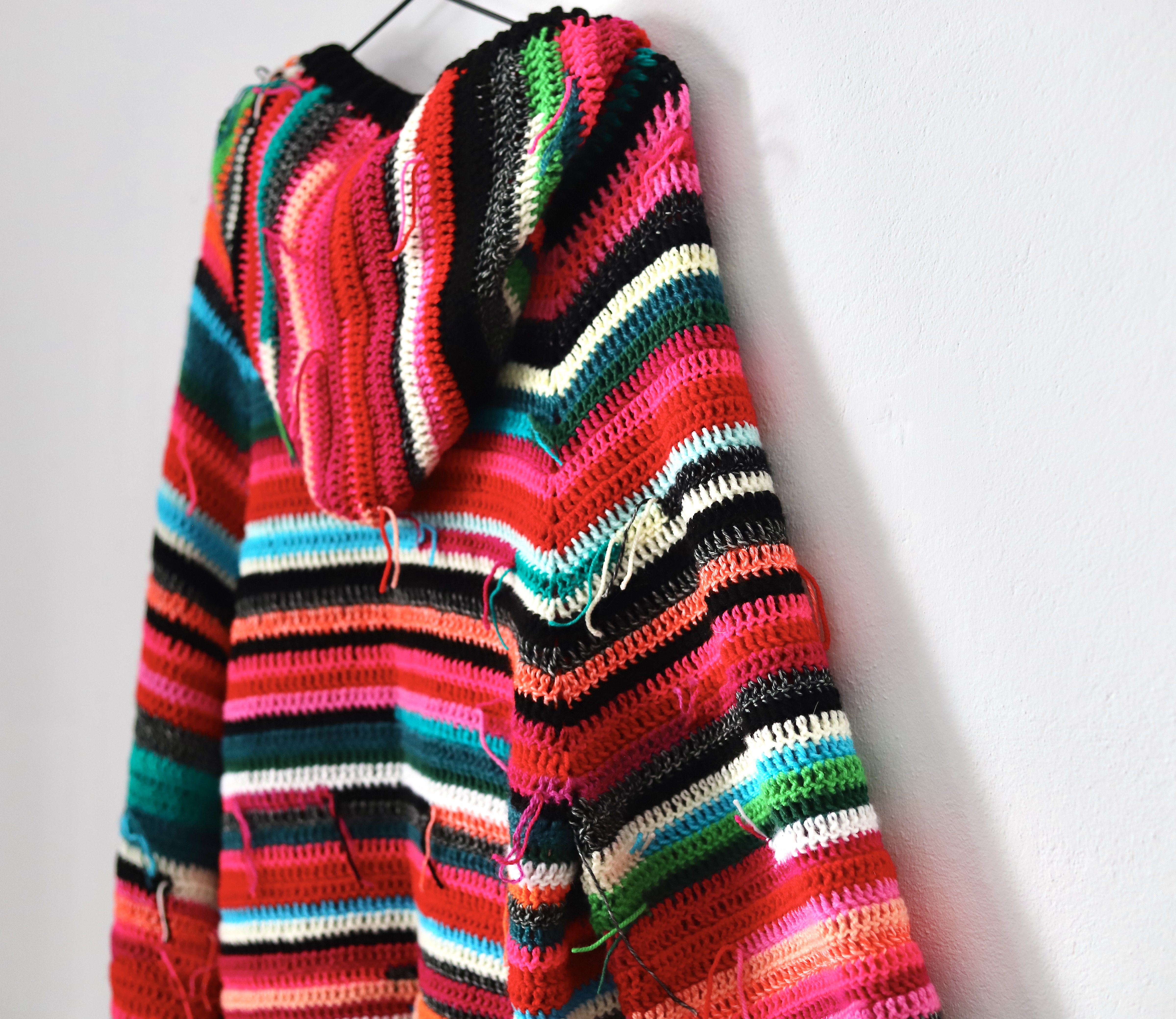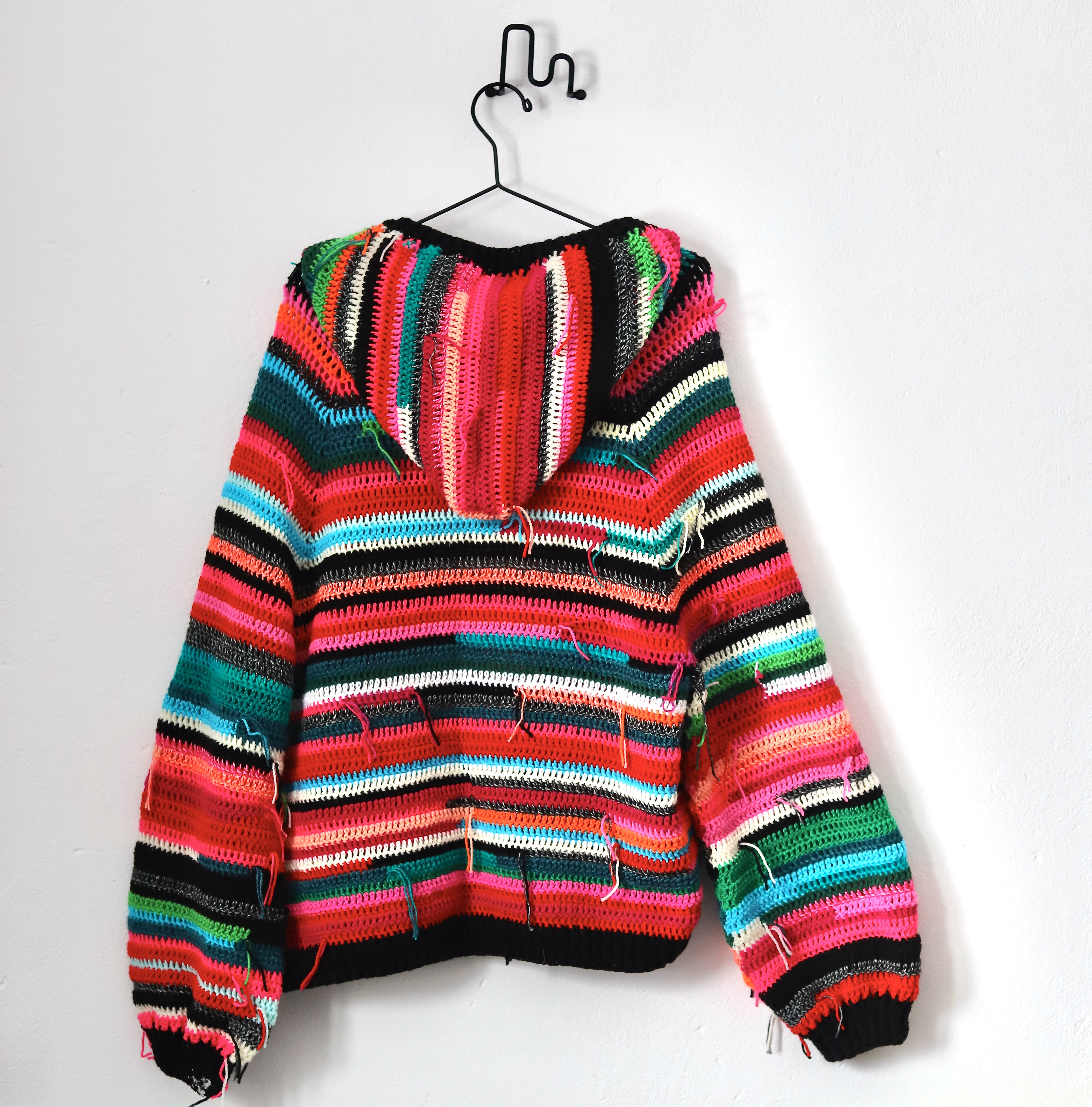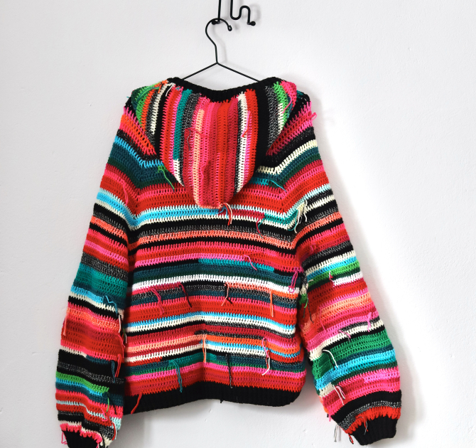 Kolorowy sweter, który w całości został wykonany ręcznie w pracowni ZUZU z różnych kawałków/resztek włóczki.