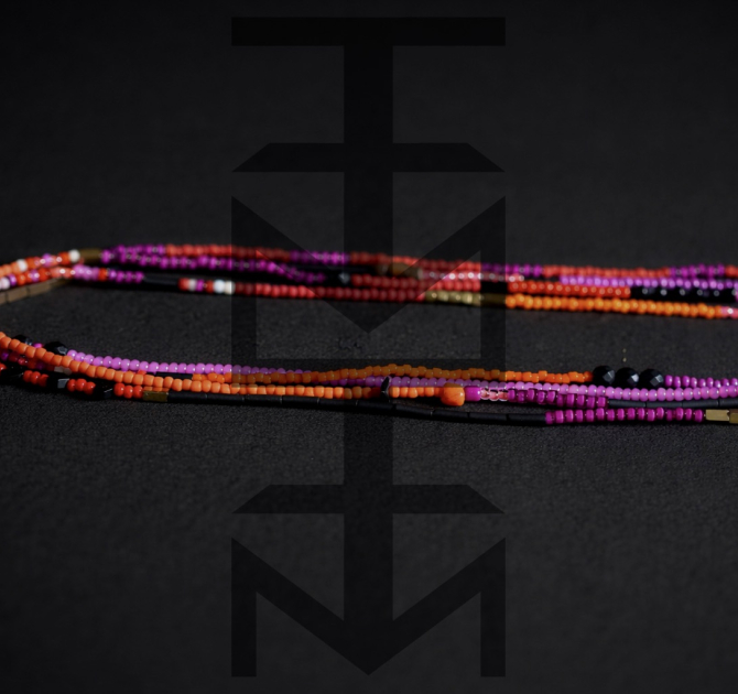 Długi kolorowy naszyjnik wykonany ze szklanych koralików i hematytu. Możliwość regulacji.