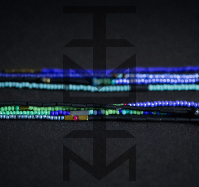 Długi kolorowy naszyjnik wykonany ze szklanych koralików i hematytu. Możliwość regulacji.