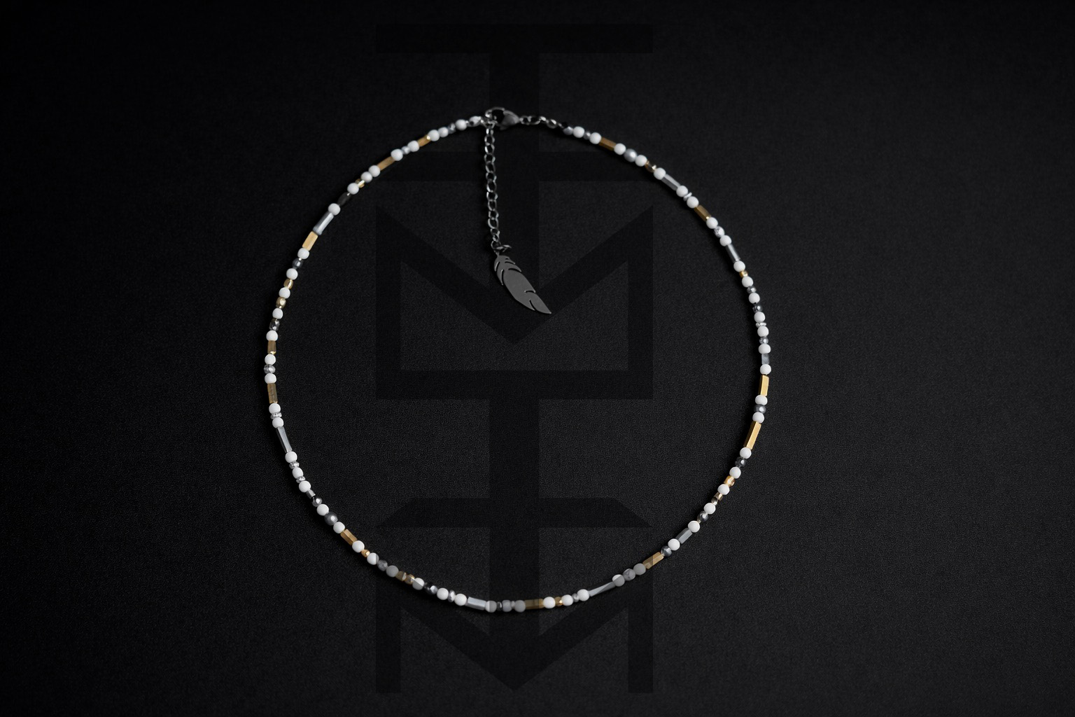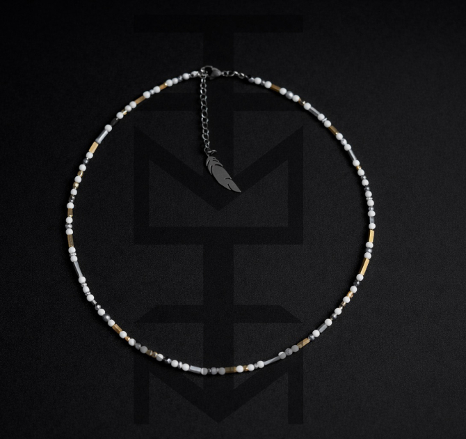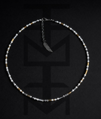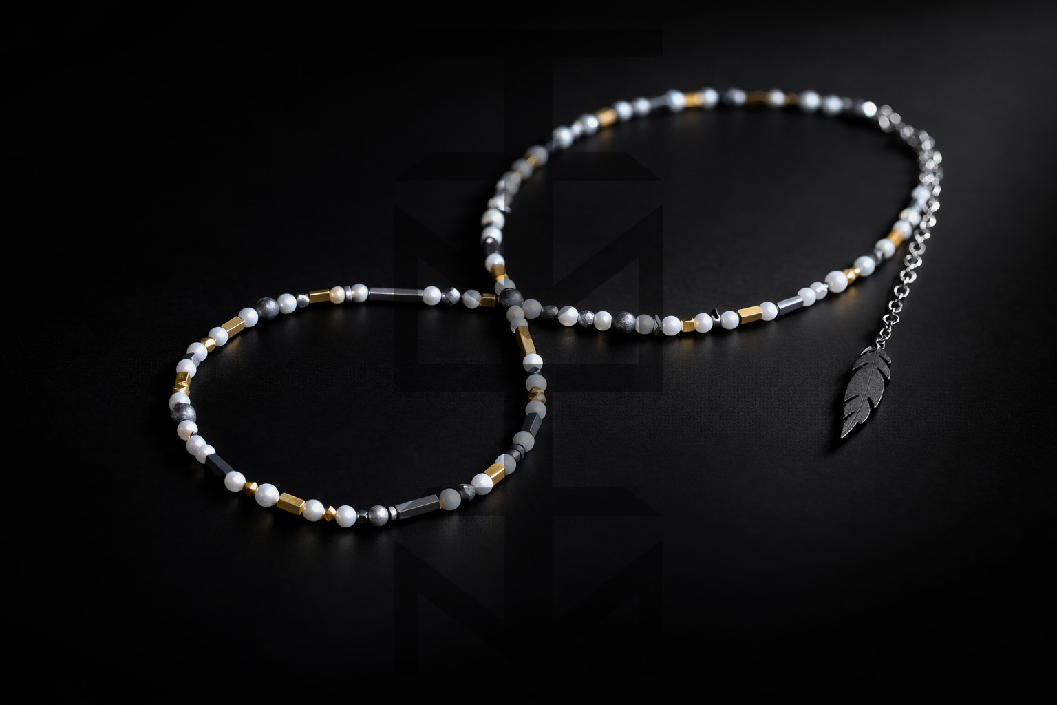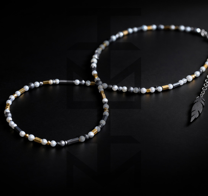 Naszyjnik z medalikiem w kształcie piórka wykonany z hematytu w odcieniach srebra i złota oraz perełek ceramicznych. Odpowiedni dla wegan.