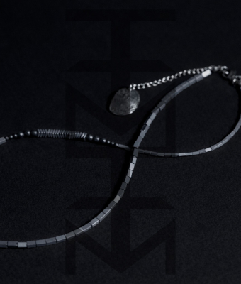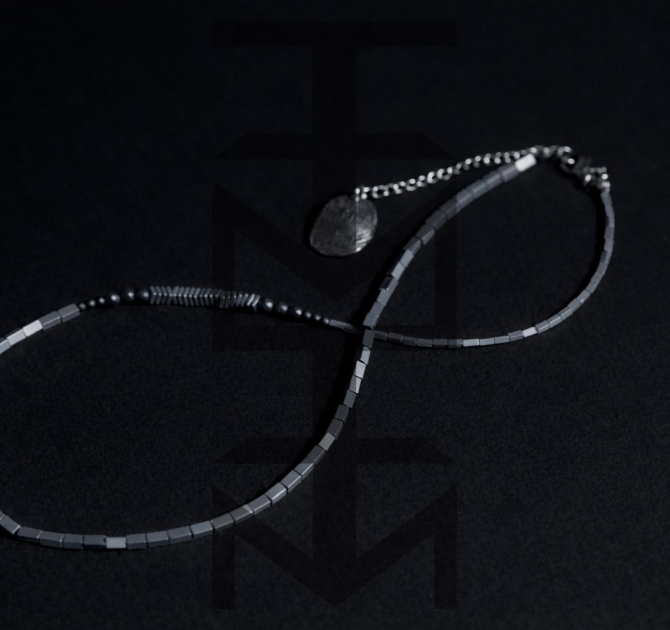 Srebrno-grafitowy naszyjnik wykonany z hematytu i stali szlachetnej. W całości zaprojektowany i wykonany w pracowni ZUZU z najwyższej jakości półfabrykatów jubilerskich. Odpowiedni dla WEGAN. Idealny na wakacje i prezent!