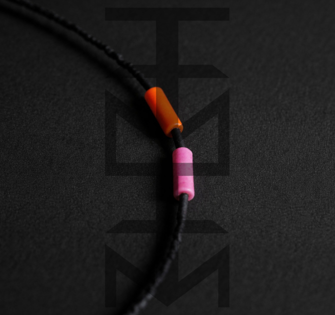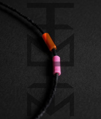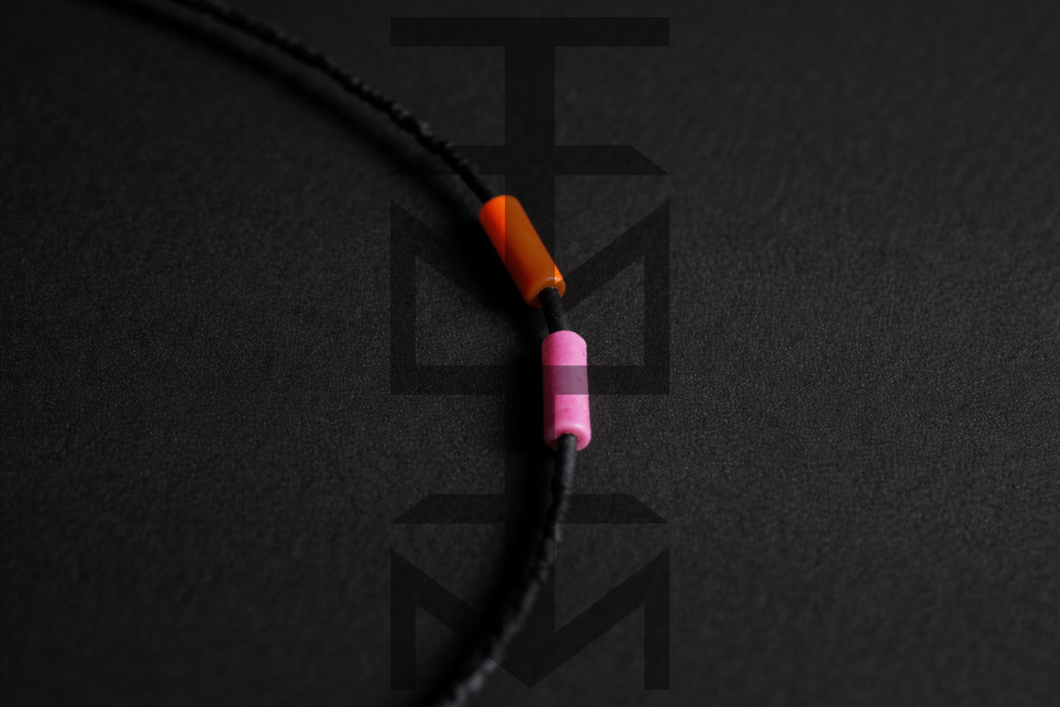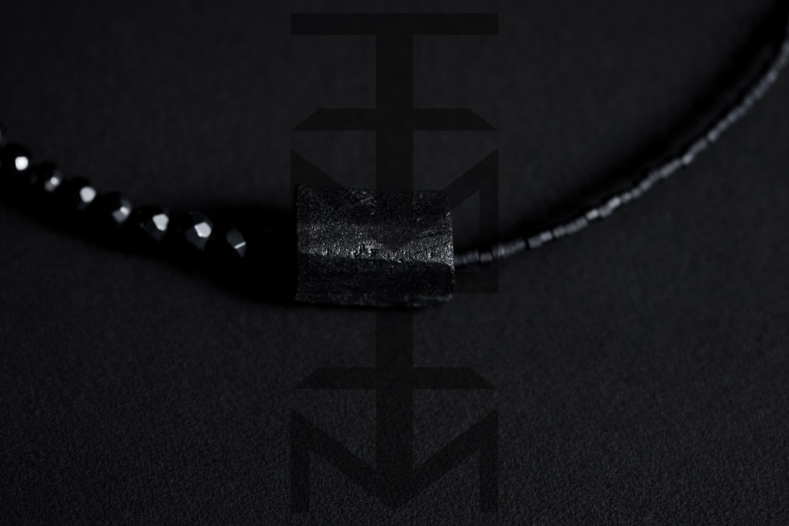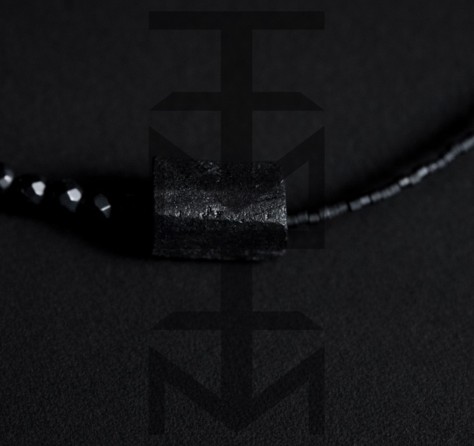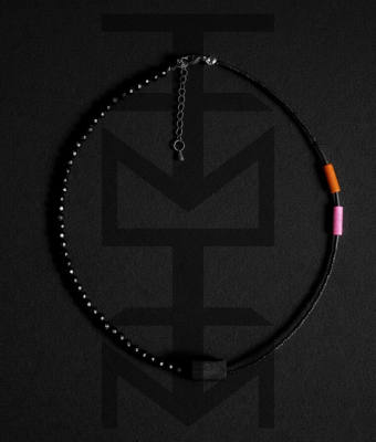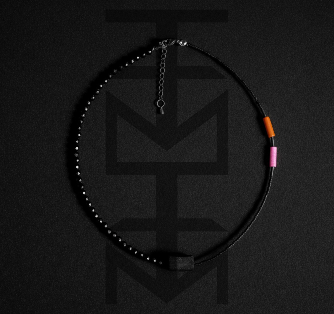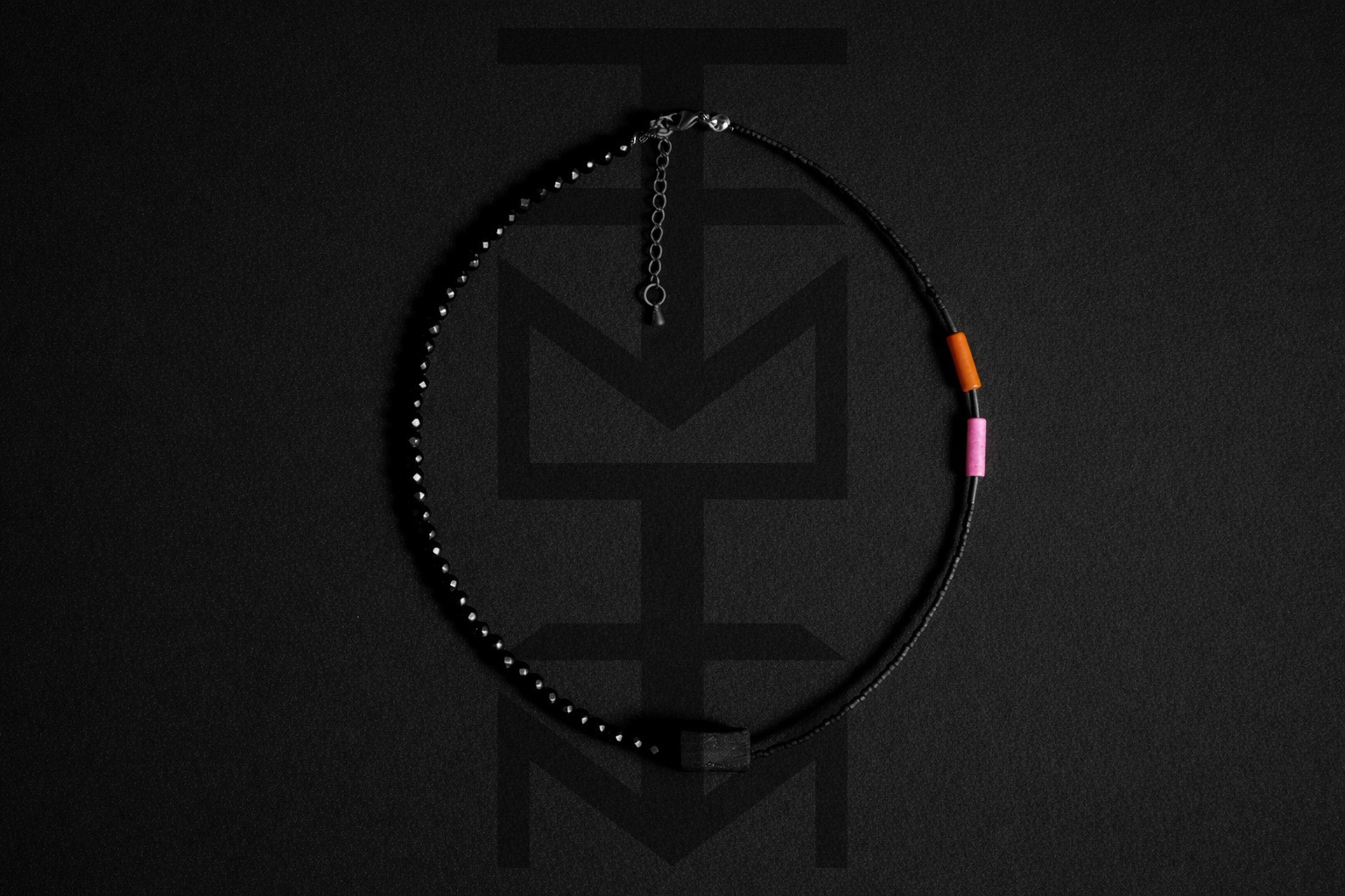 Naszyjnik wykonany z czarnego onyksu, szklanych koralików, czarnego turmalinu jako amuletu. Całość podsycona pomarańczowym i różowym howlitem syntetycznym.