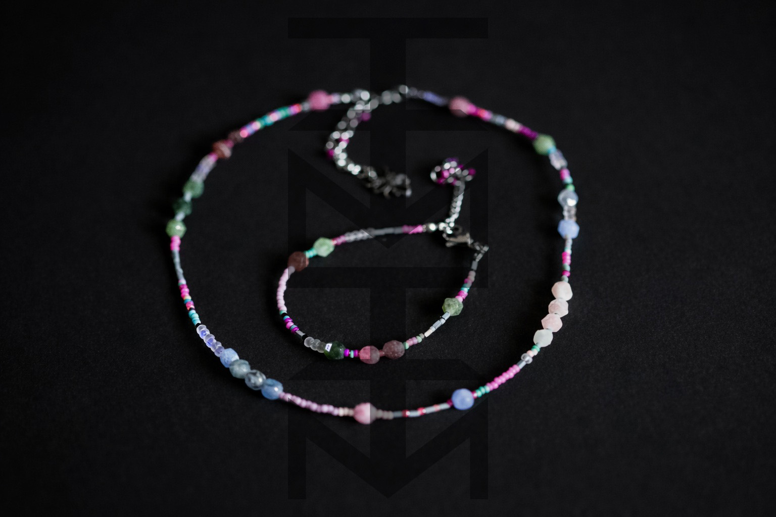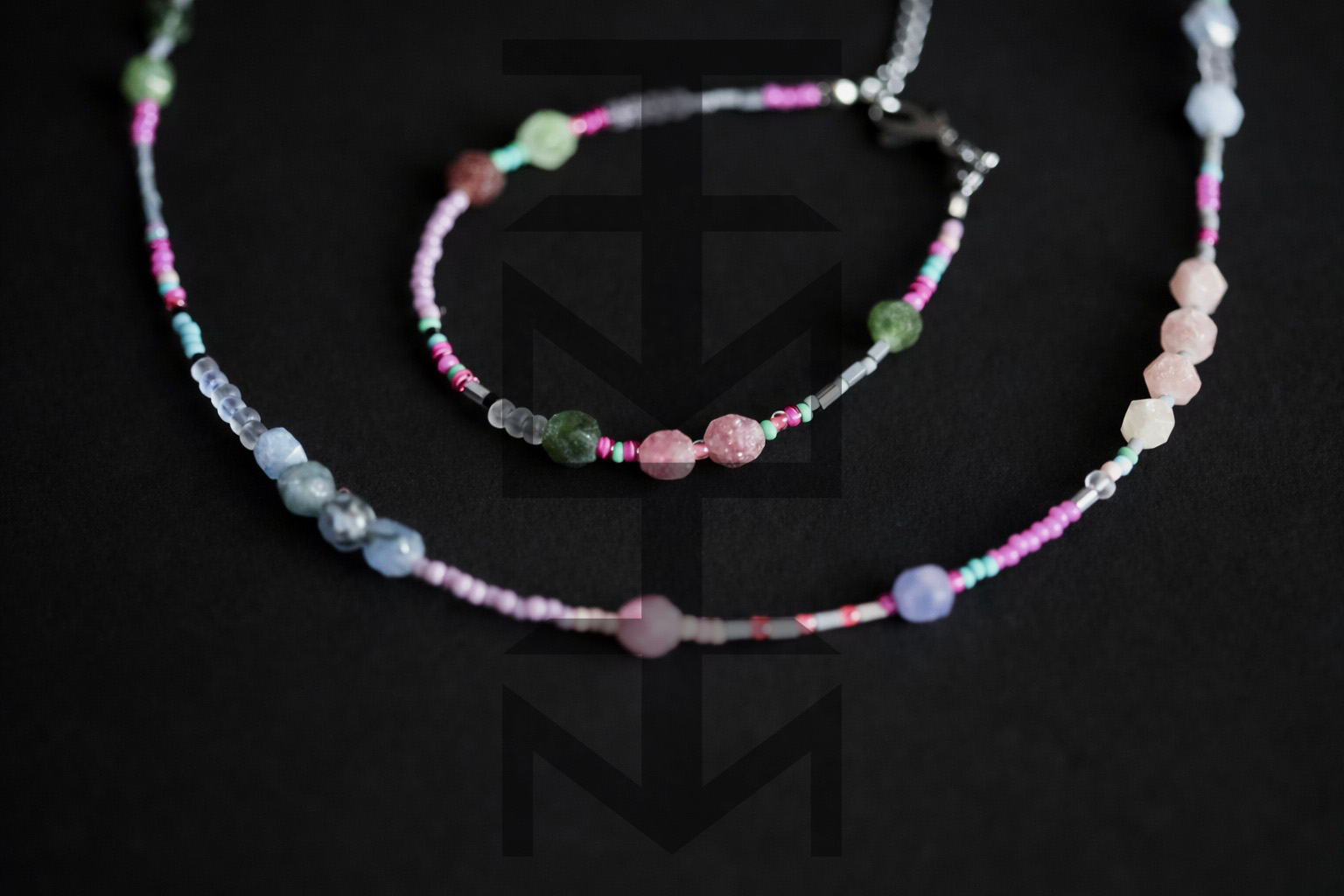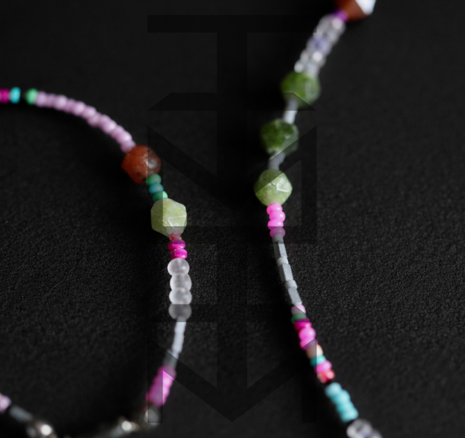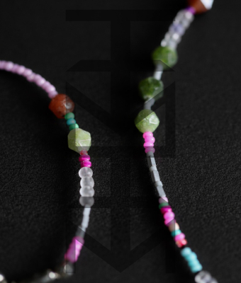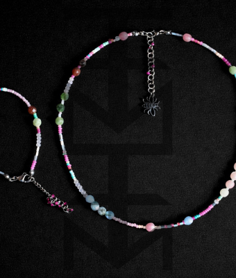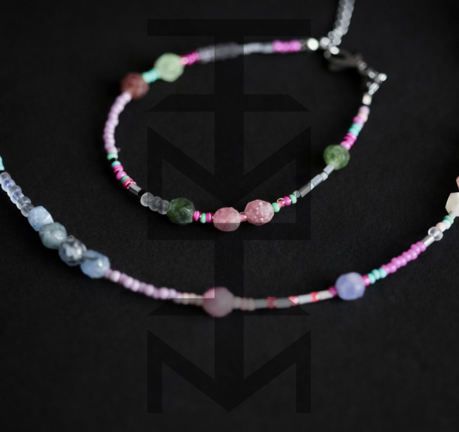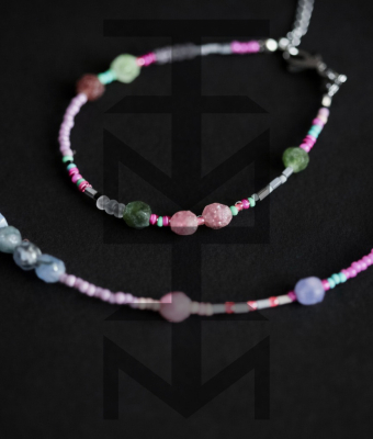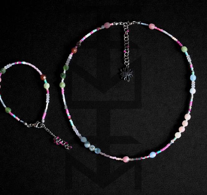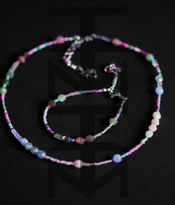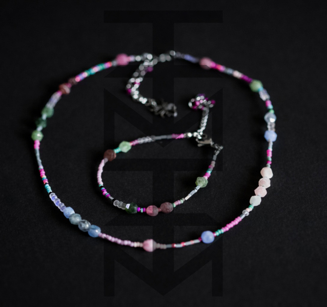 Delikatny i niezwykle kobiecy komplet w kolorach pastelowych wykonany z najwyższej jakości półfabrykatów jubilerskich, szklanych koralików, matowego hematytu srebrnego oraz pięknego Turmalinu. Odpowiedni dla WEGAN. Idealny na wakacje i prezent!