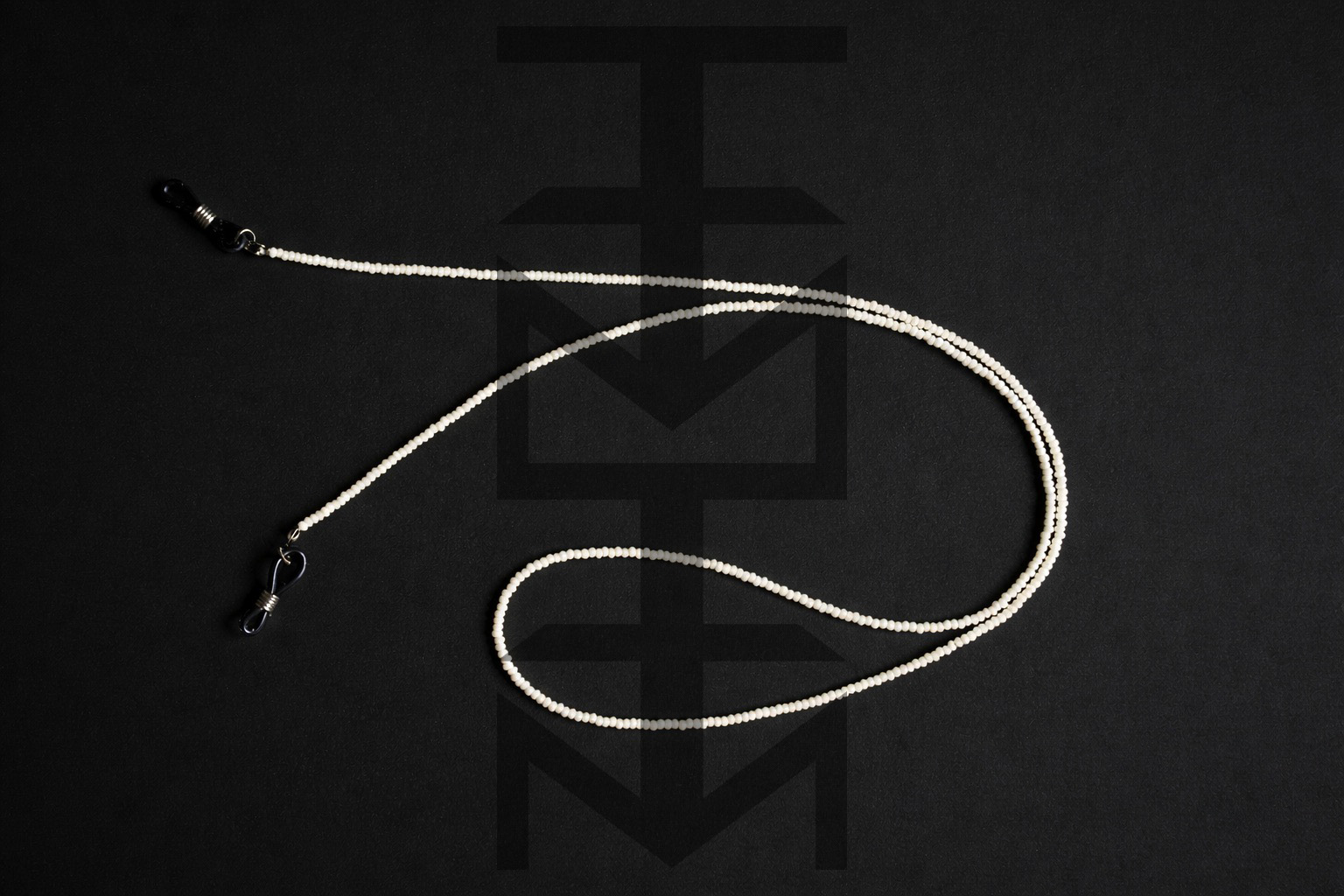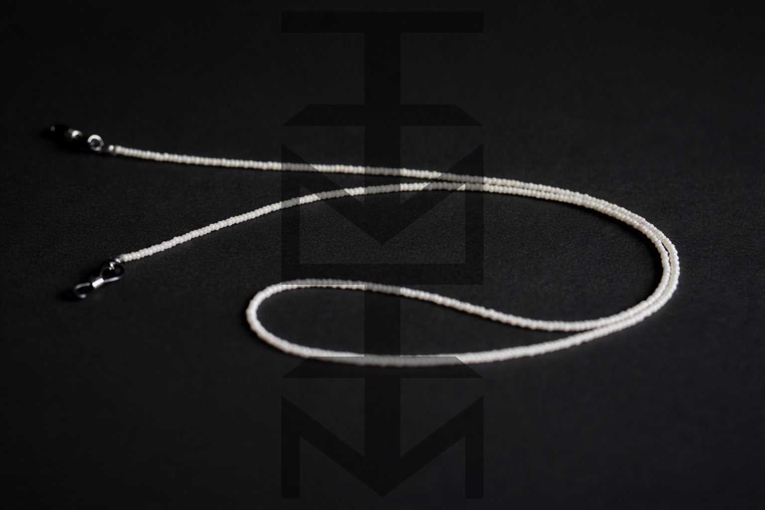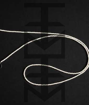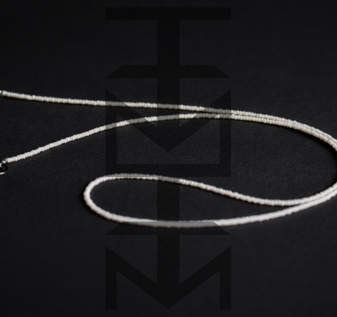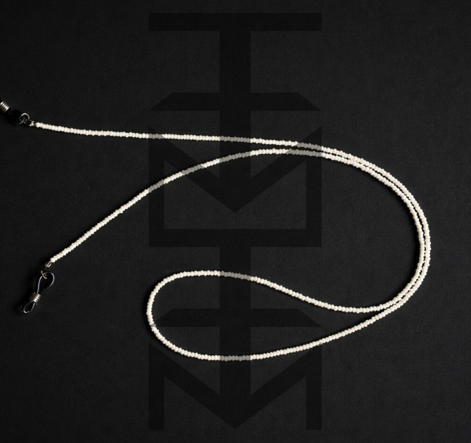 Łańcuszek wykonany ze szklanych koralików w kolorze perłowym oraz elastycznych gumek pasujących do różnych okularów. To doskonały gadżet dla osób aktywnych ceniących w modzie praktyczne rozwiązania.