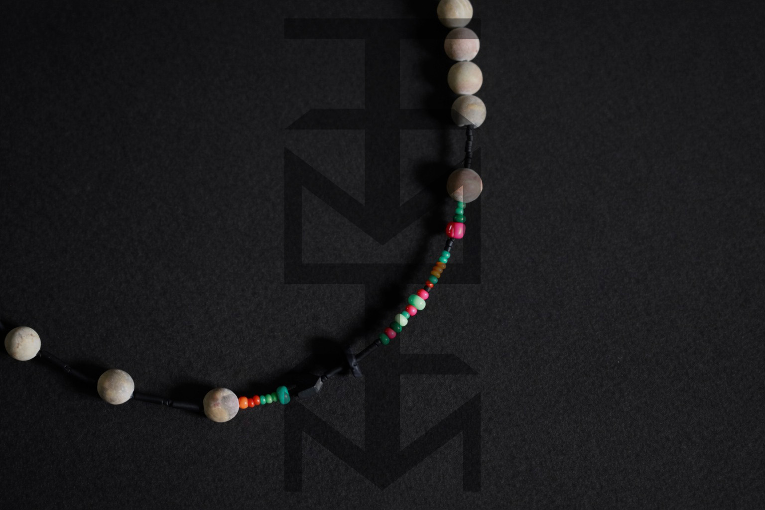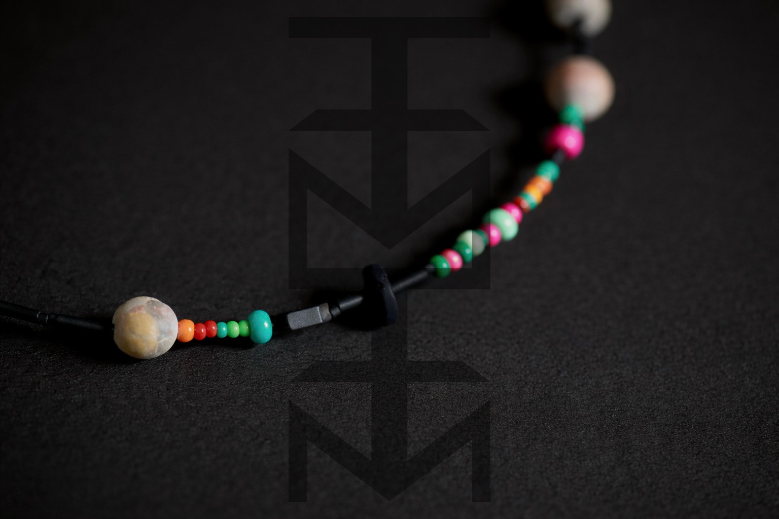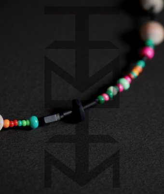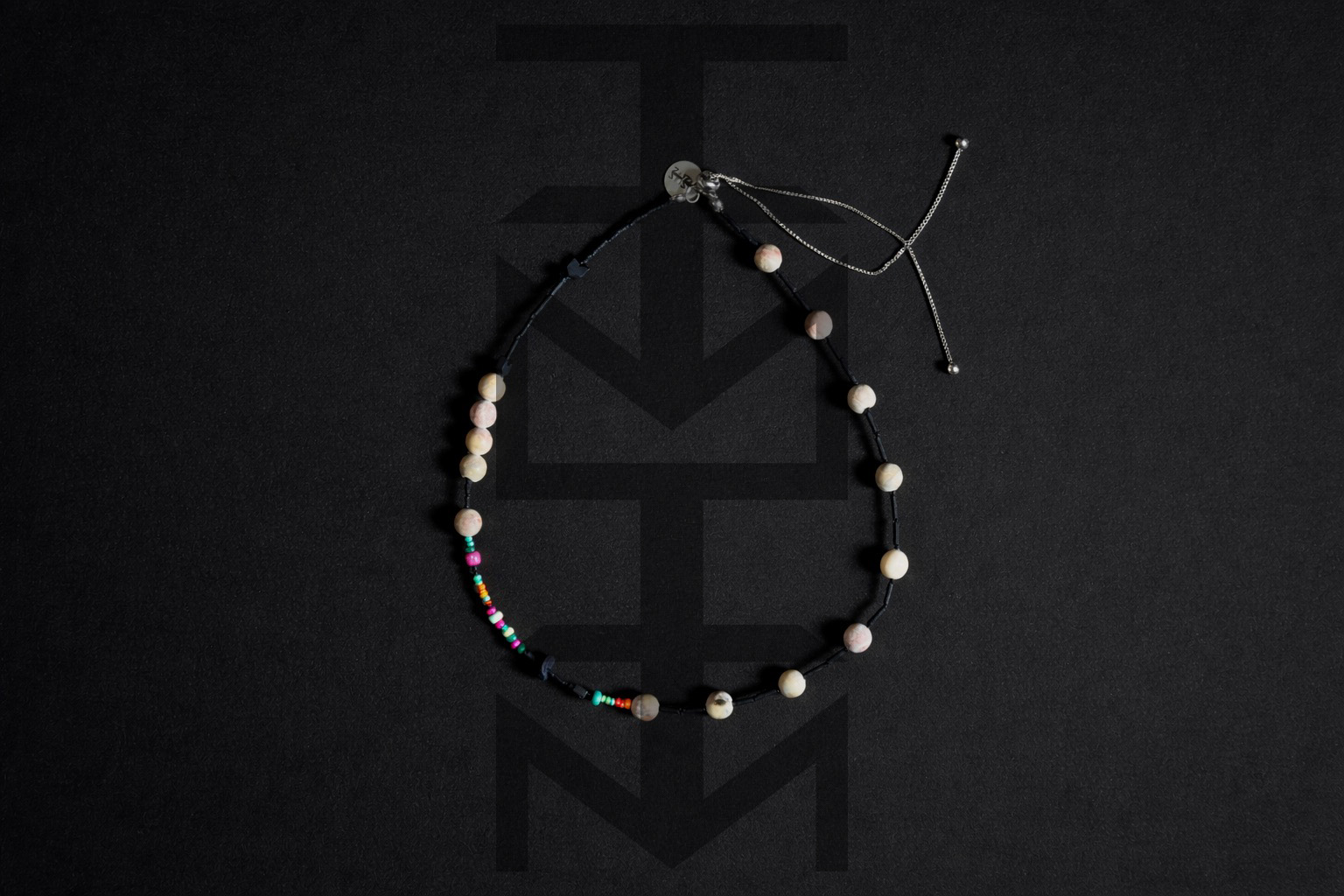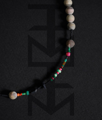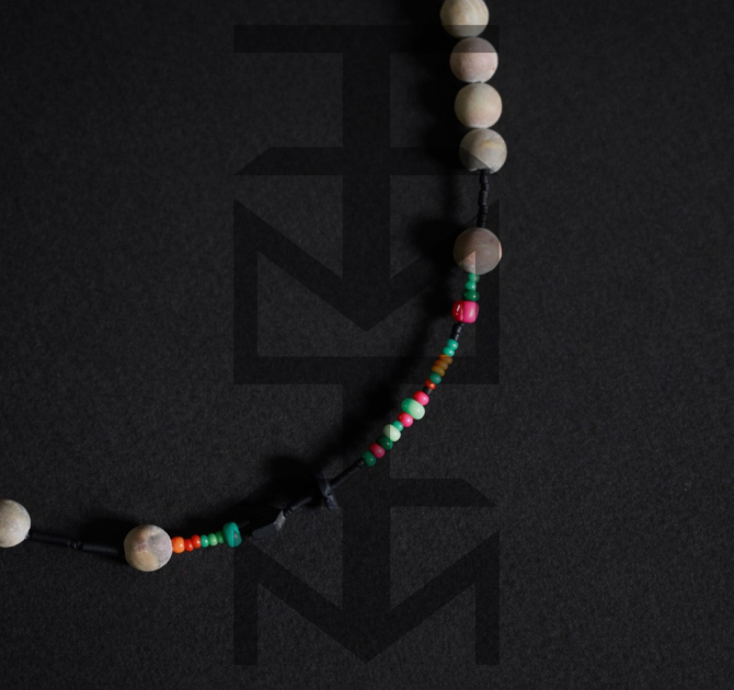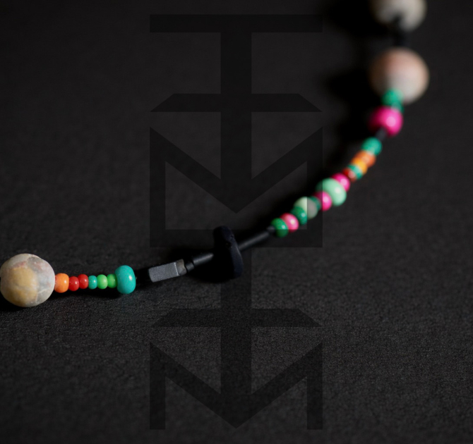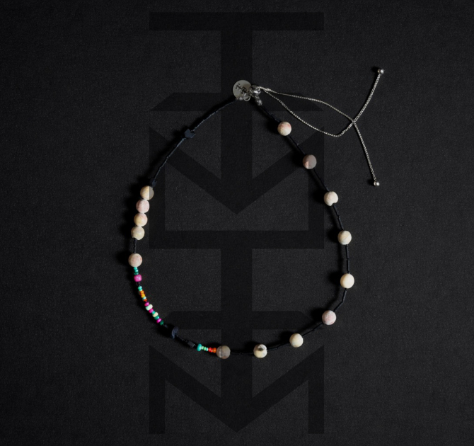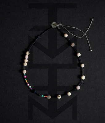 Naszyjnik wykonany z matowych czarnych i kolorowych koralików, czarnego hematytu z dodatkiem skały wulkanicznej i beżowego matowego agatu. Zapięcie naszyjnika posiada funkcję regulowania długości. Całość dopełnia nasz medalik z logo ZUZU.