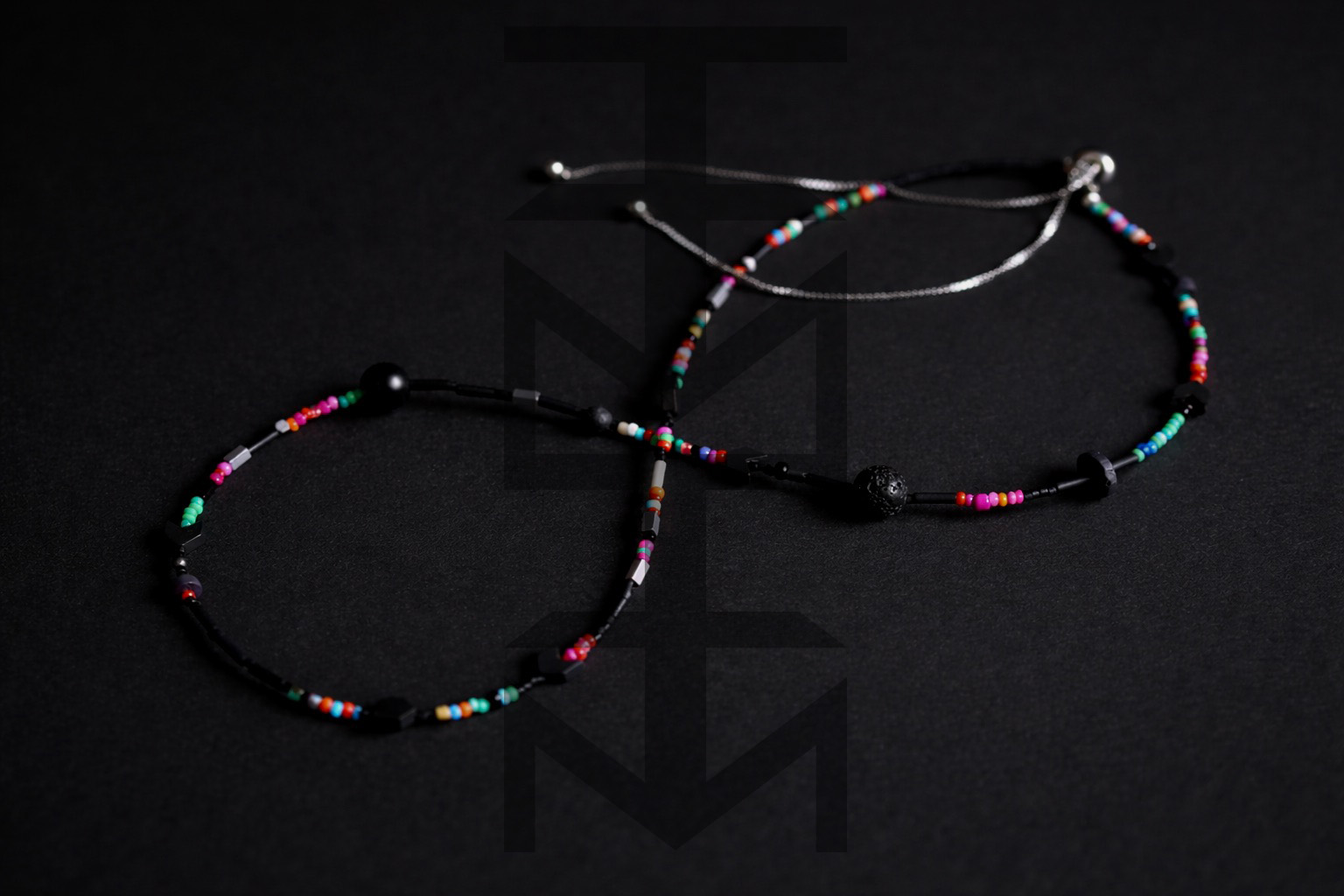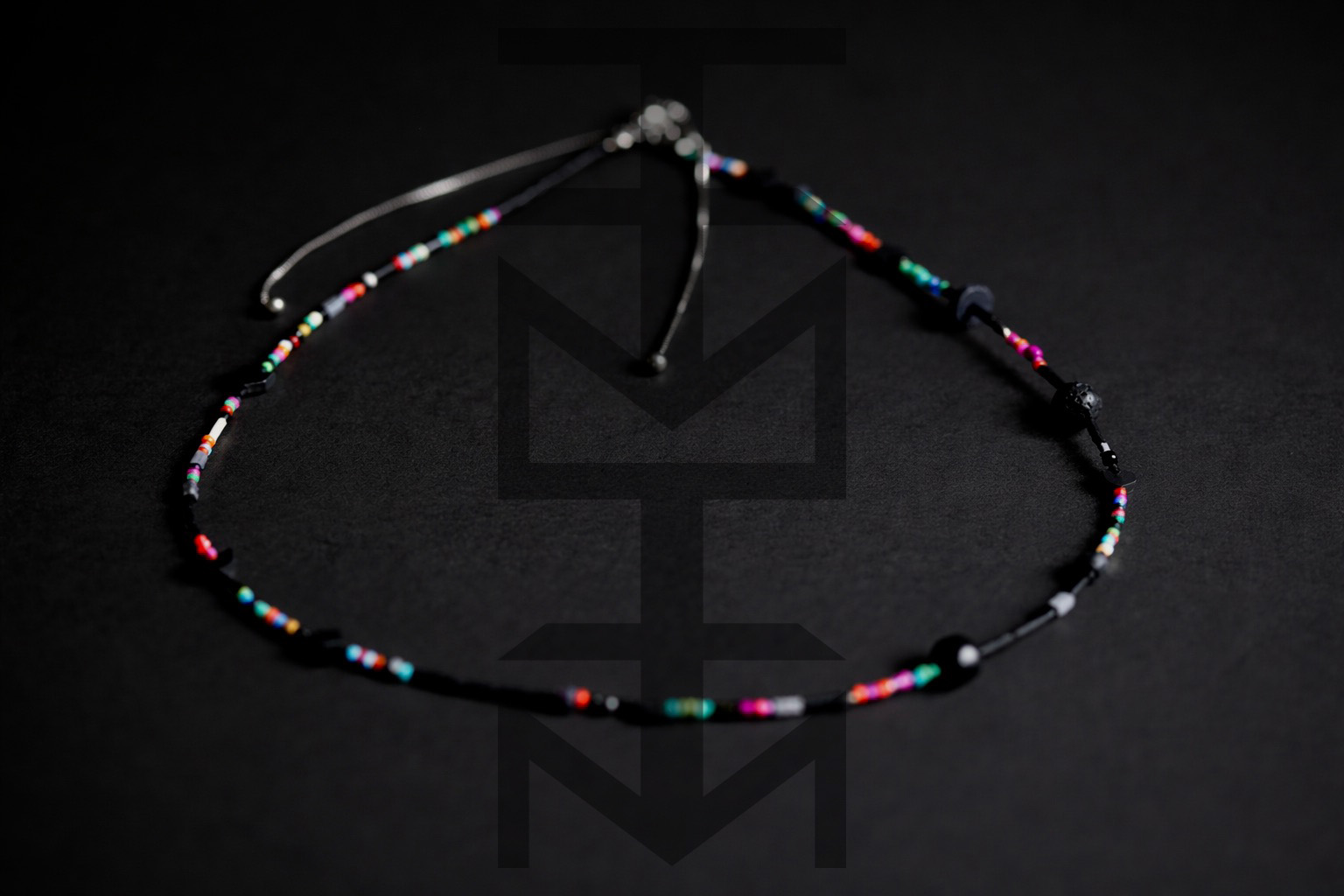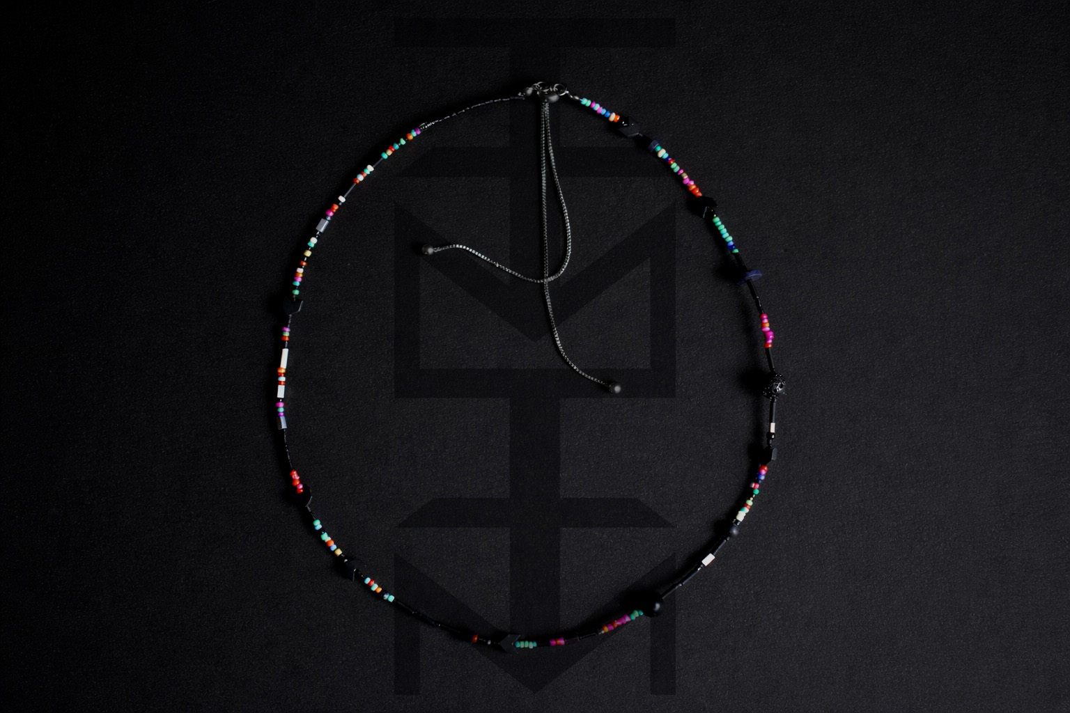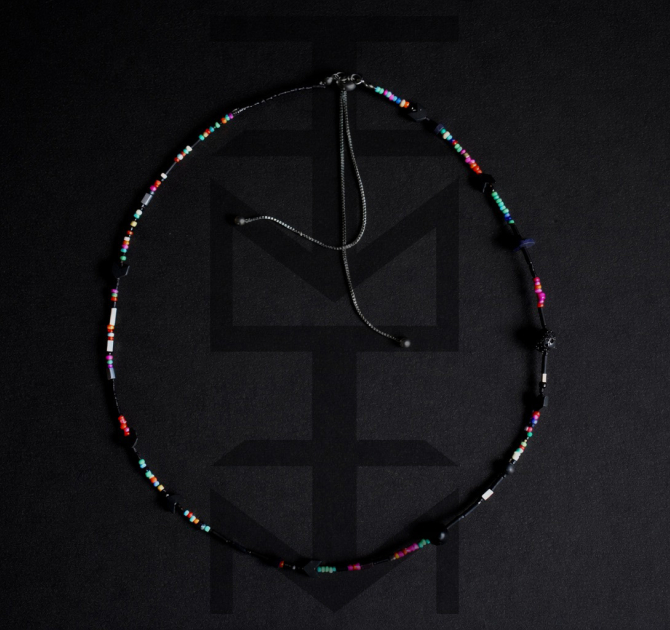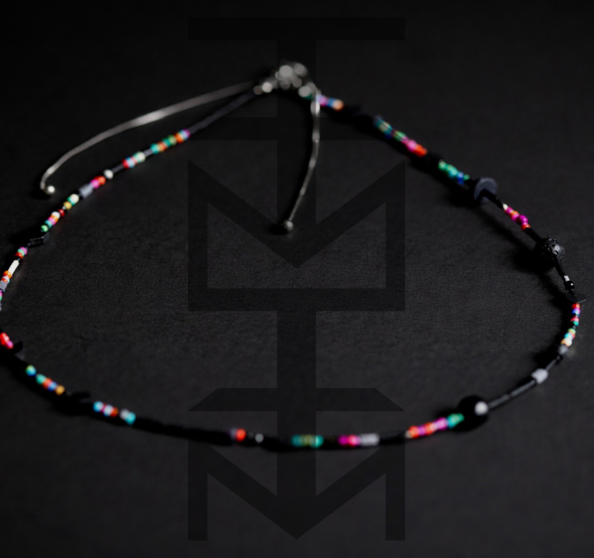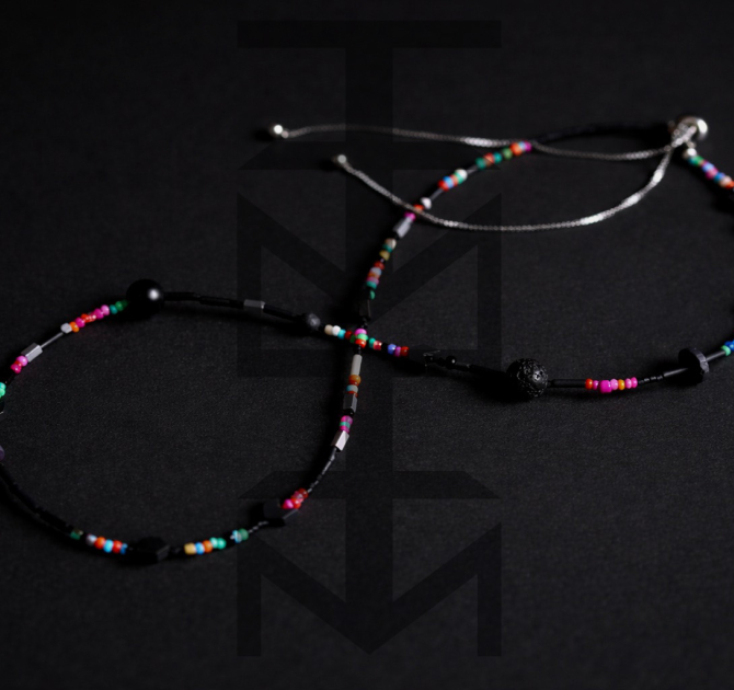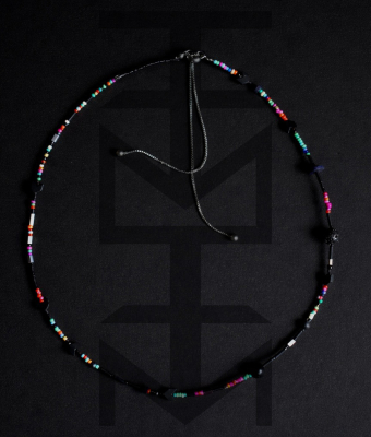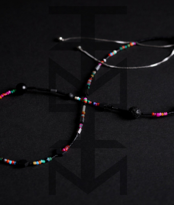 Naszyjnik wykonany z matowych czarnych koralików, hematytu i skały wulkanicznej. Zapięcie naszyjnika posiada funkcję regulowania długości.